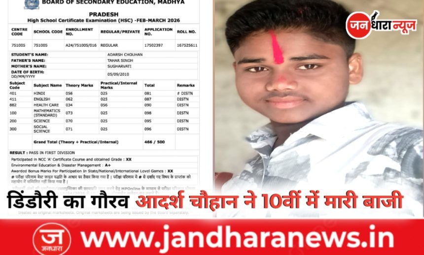 डिंडौरी। माध्यमिक शिक्षा मंडल, मध्यप्रदेश द्वारा घोषित हाई स्कूल (कक्षा 10वीं) परीक्षा परिणाम में जिले के छात्र आदर्श चौहान ने शानदार प्रदर्शन करते हुए 500 में से 466 अंक अर्जित कर प्रथम श्रेणी में सफलता प्राप्त की है। उनके उत्कृष्ट परिणाम से परिवार एवं क्षेत्र में खुशी का माहौल है।
