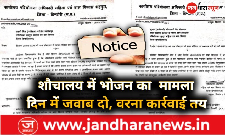 प्राप्त जानकारी के अनुसार, आंगनवाड़ी केंद्र डोमदादर में बच्चों को दिया जाने वाला गरम पका भोजन (HCM) सामुदायिक स्वच्छता परिसर (शौचालय) में तैयार किया जा रहा था। यह मामला सामने आने के बाद परियोजना अधिकारी, महिला एवं बाल विकास शहपुरा ने इसे गंभीर अनियमितता मानते हुए संबंधित आंगनवाड़ी कार्यकर्ता सुभद्रा को नोटिस जारी कर 3 दिवस के भीतर जवाब प्रस्तुत करने के निर्देश दिए हैं।