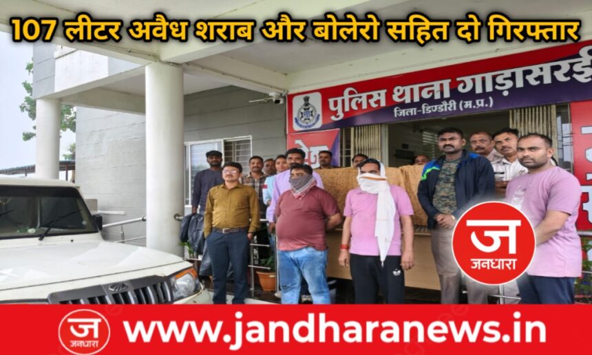 मध्यप्रदेश के डिंडौरी जिले के थाना गाडासरई पुलिस को मुखबिर से मिली सटीक सूचना के आधार पर बड़ी कार्रवाई करते हुए अवैध अंग्रेजी शराब से भरी बोलेरो वाहन को जब्त किया है। पुलिस ने वाहन से 107.280 लीटर अवैध शराब के साथ दो आरोपियों को भी गिरफ्तार किया है।