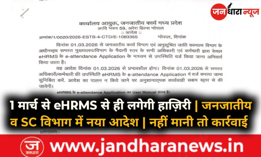 भोपाल। जनजातीय कार्य विभाग एवं अनुसूचित जाति कल्याण विभाग के अधीनस्थ समस्त मुख्यालयों एवं मैदानी स्तर पर पदस्थ अधिकारियों एवं कर्मचारियों के लिए अब ईएचआरएमएस के ई-अटेंडेंस एप्लीकेशन के माध्यम से उपस्थिति दर्ज कराना अनिवार्य कर दिया गया है। इस संबंध में आयुक्त जनजातीय कार्य मध्यप्रदेश द्वारा आदेश जारी किए गए हैं।