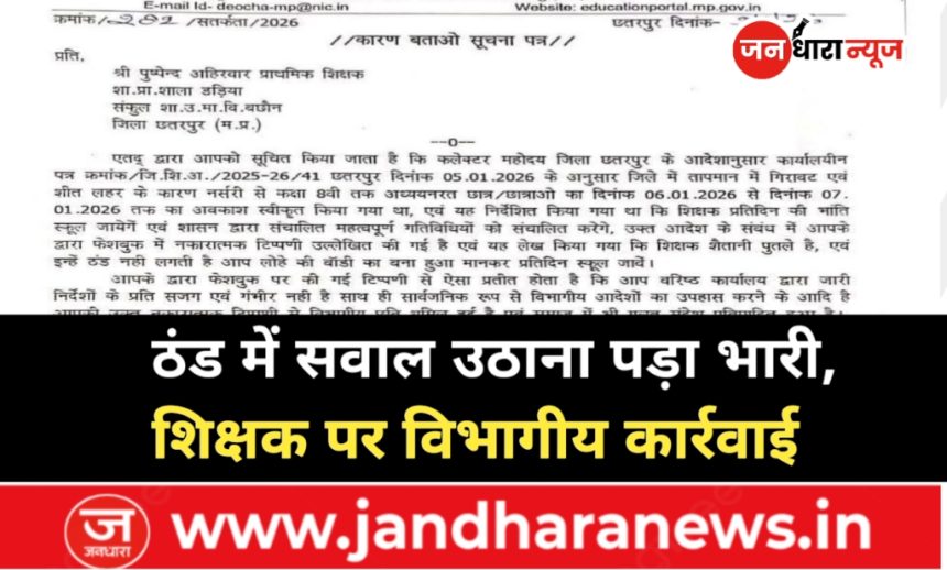 जिला शिक्षा अधिकारी ने शिक्षक को तीन दिवस के भीतर अपना तथ्यात्मक प्रतिवाद प्रस्तुत करने के निर्देश दिए हैं। निर्धारित समय सीमा में जवाब न मिलने पर एकपक्षीय अनुशासनात्मक कार्रवाई की चेतावनी भी दी गई है। मामले की जानकारी कलेक्टर छतरपुर, जिला पंचायत के मुख्य कार्यपालन अधिकारी सहित संबंधित अधिकारियों को भेज दी गई है। शिक्षा विभाग की इस कार्रवाई को अनुशासन बनाए रखने की दिशा में अहम कदम माना जा रहा है।