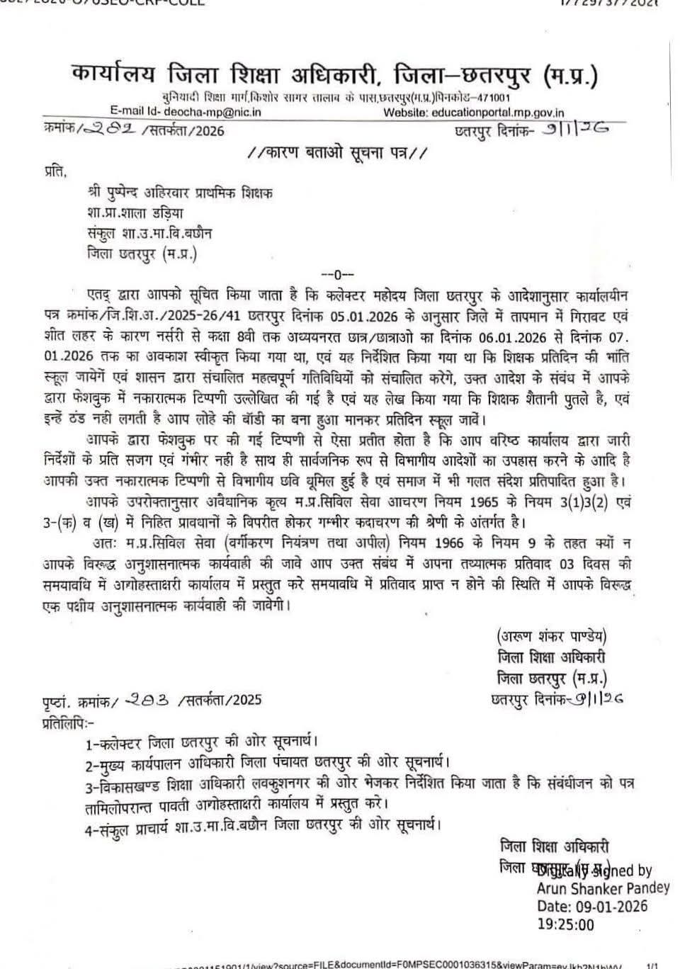 मध्यप्रदेश के छतरपुर में जिला शिक्षा अधिकारी छतरपुर द्वारा प्राथमिक शिक्षक पुष्पेन्द्र अहिरवार को कारण बताओ नोटिस जारी किया गया है। यह कार्रवाई फेसबुक पर की गई कथित आपत्तिजनक और विभागीय आदेशों के विरुद्ध टिप्पणी को लेकर की गई है।