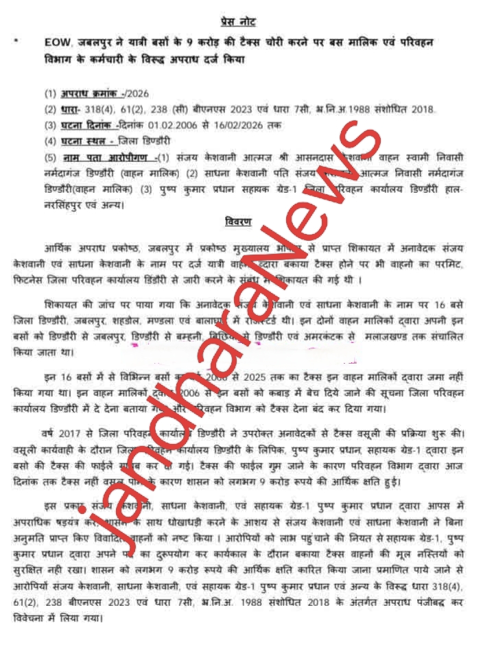 डिंडौरी। आर्थिक अपराध प्रकोष्ठ, जबलपुर (EOW) ने डिंडौरी जिले में यात्री बसों के जरिए करीब 9 करोड़ रुपये की टैक्स चोरी के मामले में बड़ी कार्रवाई करते हुए बस मालिक दंपत्ति और परिवहन विभाग के एक कर्मचारी सहित अन्य के विरुद्ध आपराधिक प्रकरण दर्ज किया है। मामला वर्ष 2006 से 16 फरवरी 2026 के बीच का बताया गया है।