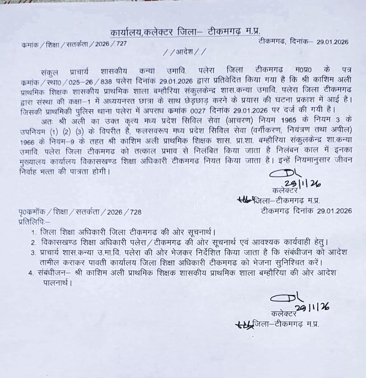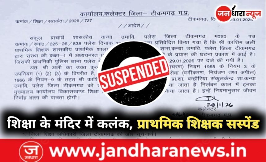 प्राप्त जानकारी के अनुसार, संस्था में अध्ययनरत छात्रा के साथ हुई इस घटना की शिकायत के बाद पुलिस थाना पलेरा में अपराध क्रमांक 0027 दिनांक 29 जनवरी 2026 को प्राथमिकी दर्ज की गई। मामला उजागर होते ही प्रशासन ने इसे अत्यंत गंभीरता से लिया। बरहाल कलेक्टर जिला टीकमगढ़ द्वारा जारी आदेश में उल्लेख किया गया कि शिक्षक का यह कृत्य मध्य प्रदेश सिविल सेवा (आचरण) नियम 1965 के नियम-3 के विपरीत है। इसके चलते मध्य प्रदेश सिविल सेवा (वर्गीकरण, नियंत्रण तथा अपील) नियम 1966 के नियम-9 के तहत आरोपी शिक्षक को तत्काल प्रभाव से निलंबित कर दिया गया है।