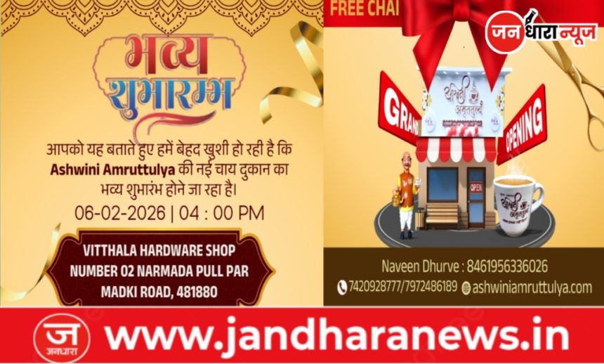 डिंडौरी। चाय प्रेमियों के लिए एक खुशखबरी है। शहर में Ashwini Amruttulya की नई चाय दुकान का भव्य शुभारंभ होने जा रहा है। इस अवसर को लेकर क्षेत्र में उत्साह का माहौल है। जानकारी के अनुसार 06 फरवरी 2026 (गुरुवार) को शाम 04:00 बजे Ashwini Amruttulya की नई चाय दुकान का उद्घाटन किया जाएगा। यह दुकान Vitthala Hardware Shop नंबर-02, नर्मदा पुल के पास, मड़की रोड, पर स्थित है। Ashwini Amruttulya अपने शुद्ध स्वाद, पारंपरिक विधि और गुणवत्तापूर्ण चाय के लिए जानी जाती है। नई दुकान के शुभारंभ के साथ ही स्थानीय लोगों को उम्दा स्वाद वाली चाय एक नए ठिकाने पर उपलब्ध होगी। दुकान के शुभारंभ अवसर पर शहर के गणमान्य नागरिकों, व्यापारियों और चाय प्रेमियों की उपस्थिति रहने की संभावना है। आयोजकों ने सभी नागरिकों से कार्यक्रम में शामिल होकर शुभारंभ को यादगार बनाने की अपील की है।