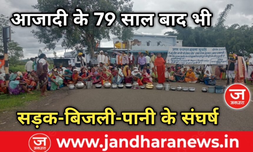 मध्यप्रदेश के डिंडौरी जिले में आज भी ग्रामीण मूलभूत सुविधाओं से वंचित हैं। आज़ादी के 79 वर्षों बाद भी सड़क, पानी और बिजली जैसी बुनियादी जरूरतों के लिए लोगों को संघर्ष करना पड़ रहा है। यही हाल ग्राम पंचायत झरना घुघरी का है, जहां मंगलवार को ग्रामीणों ने तीन सूत्रीय मांगों को लेकर चक्काजाम हड़ताल किया।