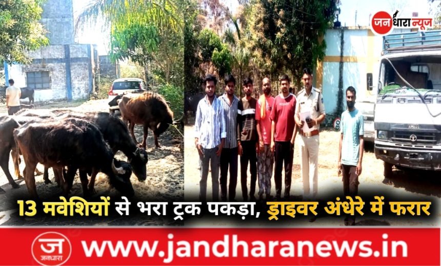 सूचना मिलते ही पुलिस टीम मौके पर पहुंची और ग्रामीणों की मदद से ट्रक को घेराबंदी कर रोक लिया। जब पुलिस ने ट्रक की तलाशी ली तो उसमें करीब 13 मवेशियों को बेहद संकरे स्थान में क्रूरता के साथ भरा हुआ पाया गया। कई मवेशियों की हालत भी खराब बताई जा रही है। पुलिस की कार्रवाई के दौरान ट्रक चालक अंधेरे का फायदा उठाकर वाहन छोड़कर मौके से फरार हो गया। पुलिस ने ट्रक को जब्त कर लिया और सभी मवेशियों को सुरक्षित बाहर निकालकर सुरक्षित स्थान पर भेजने की व्यवस्था की।