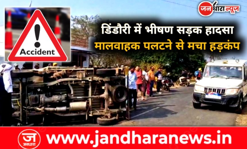 डिंडौरी। जिले के शहपुरा थाना क्षेत्र अंतर्गत मेंहदवानी मार्ग पर चरगांव के पास बुधवार दोपहर एक बड़ा सड़क हादसा हो गया। तेज रफ्तार मालवाहक वाहन अनियंत्रित होकर सड़क पर पलट गया। हादसे में वाहन में सवार दो दर्जन से अधिक ग्रामीण घायल हो गए। घटना के बाद मौके पर चीख-पुकार मच गई और कुछ समय के लिए यातायात भी प्रभावित हुआ।