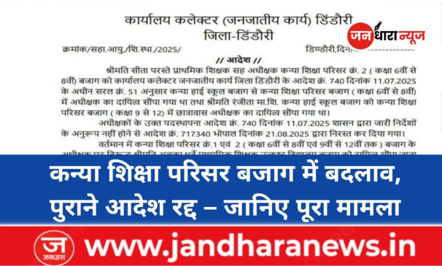 जारी आदेश के अनुसार, आदेश 11 जुलाई 2025 के तहत सीता परस्ते, प्राथमिक शिक्षक को कन्या शिक्षा परिसर बजाग (कक्षा 6वीं से 8वीं) और रंजीता मरावी, माध्यमिक शिक्षक को कन्या शिक्षा परिसर बजाग (कक्षा 9वीं से 12वीं) में अधीक्षक का दायित्व सौंपा गया था। लेकिन शासन द्वारा जारी निर्देशों के अनुरूप न होने के कारण उक्त आदेश को भोपाल से जारी आदेश दिनांक 21 अगस्त 2025 द्वारा निरस्त कर दिया गया।