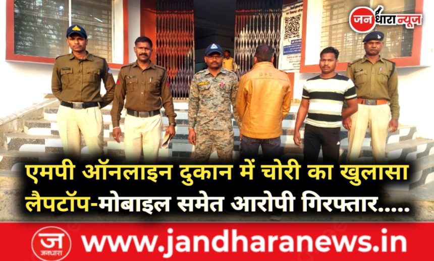 डिंडौरी। थाना शाहपुर क्षेत्र अंतर्गत एमपी ऑनलाइन एवं किराना दुकान में हुई चोरी का पुलिस ने खुलासा करते हुए आरोपी को चोरी गए माल मशरूका सहित गिरफ्तार कर लिया है। पुलिस ने आरोपी को न्यायालय में पेश कर न्यायिक रिमांड पर भेज दिया है। प्राप्त जानकारी के अनुसार, दिनांक 22 नवंबर 2025 को फरियादी रामस्वरूप यादव पिता अमरलाल उम्र 27 वर्ष निवासी ग्राम गनेशपुर थाना शाहपुर जिला डिंडौरी ने थाना शाहपुर में रिपोर्ट दर्ज कराई थी कि 21 नवंबर 2025 की दरमियानी रात अज्ञात चोर द्वारा उनकी एमपी ऑनलाइन एवं किराना दुकान का ताला तोड़कर एक लैपटॉप, एक मोबाइल फोन एवं नगद राशि सहित कुल करीब 70 हजार रुपये की चोरी कर ली गई। मामले में थाना शाहपुर में अपराध क्रमांक 349/25 धारा 331(4), 305(ए) भारतीय न्याय संहिता के तहत अपराध पंजीबद्ध कर विवेचना शुरू की गई थी।