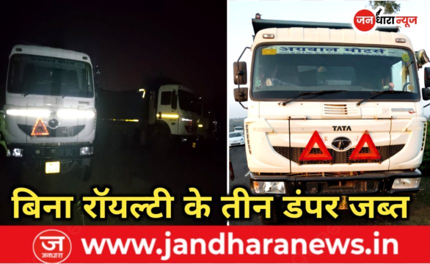 जानकारी के अनुसार, 8 नवम्बर 2025 को खनिज विभाग की टीम ने एक डंपर को पकड़ा जो बिना रॉयल्टी के गिट्टी का परिवहन कर रहा था। इसके अगले दिन 9 नवम्बर 2025 को दो और डंपर इसी तरह अवैध परिवहन करते हुए पकड़े गए। जप्त किए गए वाहनों के क्रमांक — MP19ZL4090, MP19ZF5941, और MP20HB5357 हैं।
