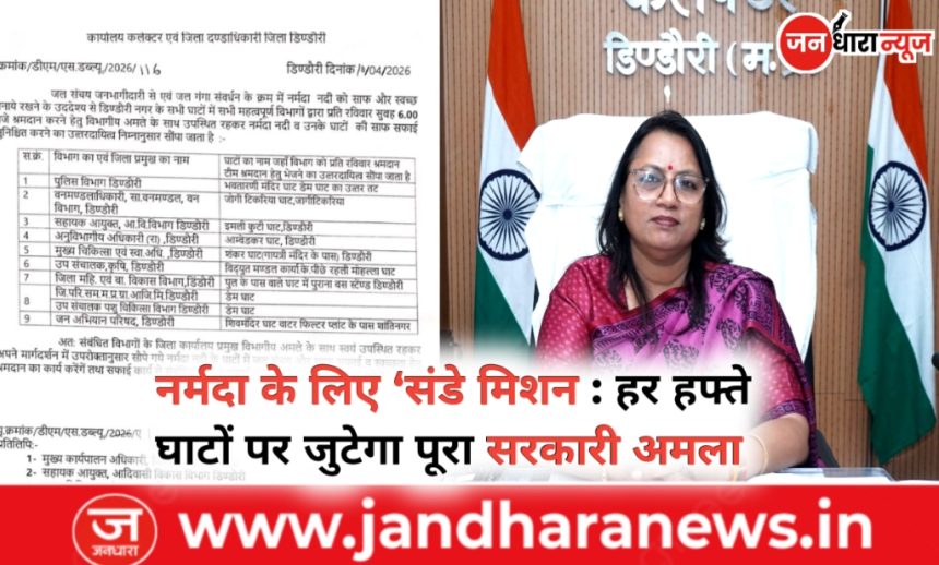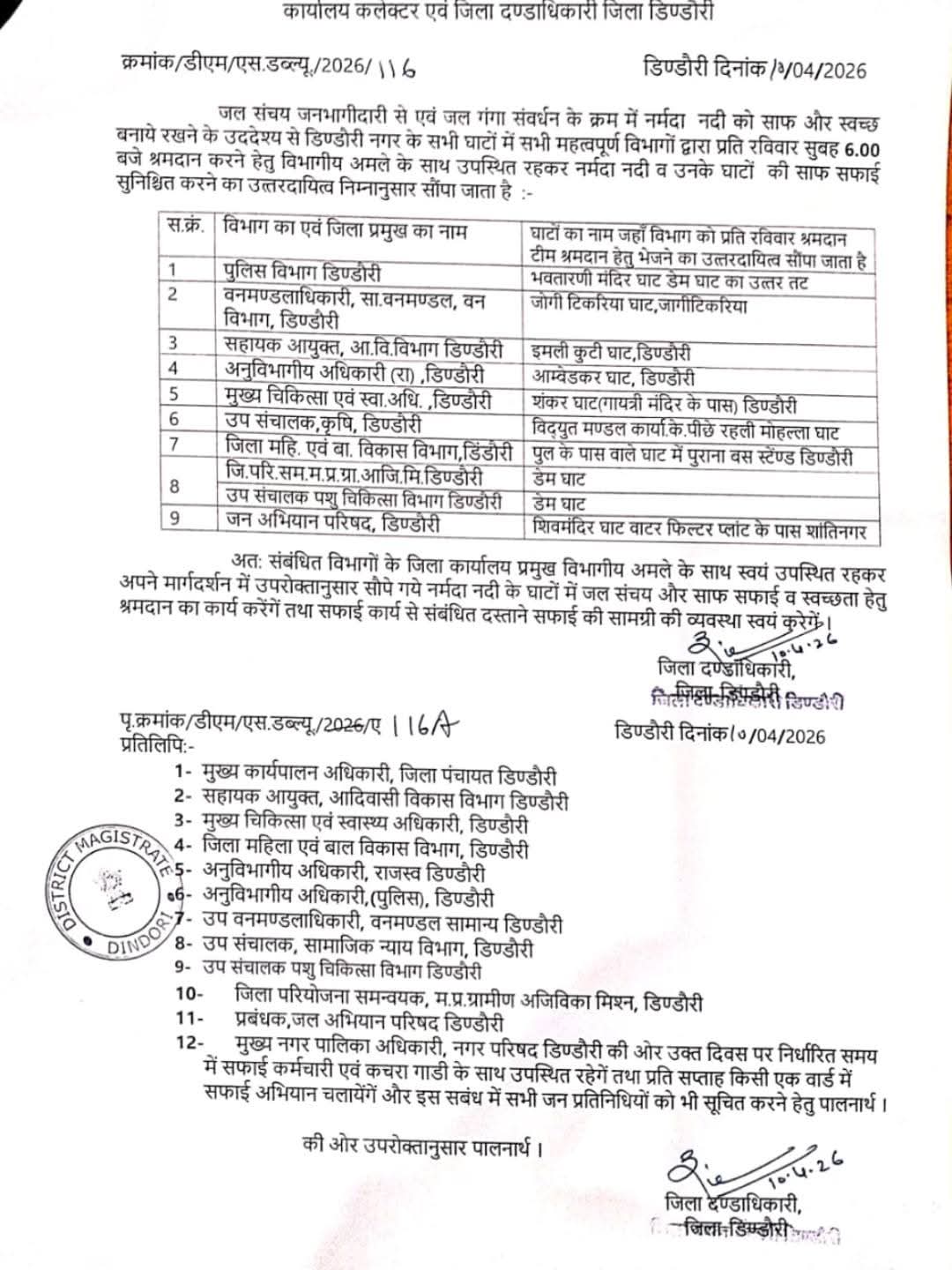 डिंडौरी। नर्मदा नदी को स्वच्छ और निर्मल बनाए रखने के लिए जिला प्रशासन ने अहम कदम उठाया है। कलेक्टर अंजू पवन भदौरिया के निर्देश पर अब प्रत्येक रविवार सुबह 6 बजे डिंडौरी नगर के सभी प्रमुख नर्मदा घाटों पर अनिवार्य श्रमदान कराया जाएगा। जिसके लिए कलेक्टर कार्यालय के द्वारा एक आदेश जारी किया गया है।
