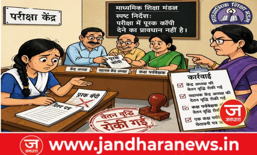प्राप्त जानकारी के अनुसार, कुमारी आराधना गजेंद्र, जो मॉडल उच्चतर माध्यमिक विद्यालय बजाग की छात्रा हैं, अंग्रेजी विषय की परीक्षा दे रही थीं। इसी दौरान केंद्र अध्यक्ष, सहायक केंद्र अध्यक्ष एवं कक्ष पर्यवेक्षक द्वारा नियमों की अनदेखी करते हुए उन्हें पूरक कॉपी प्रदान कर दी गई। मामले को गंभीरता से लेते हुए माध्यमिक शिक्षा मंडल ने छात्रा का परीक्षा परिणाम रोक दिया है। अब छात्रा को द्वितीय अवसर के तहत पुनः परीक्षा देनी पड़ेगी।