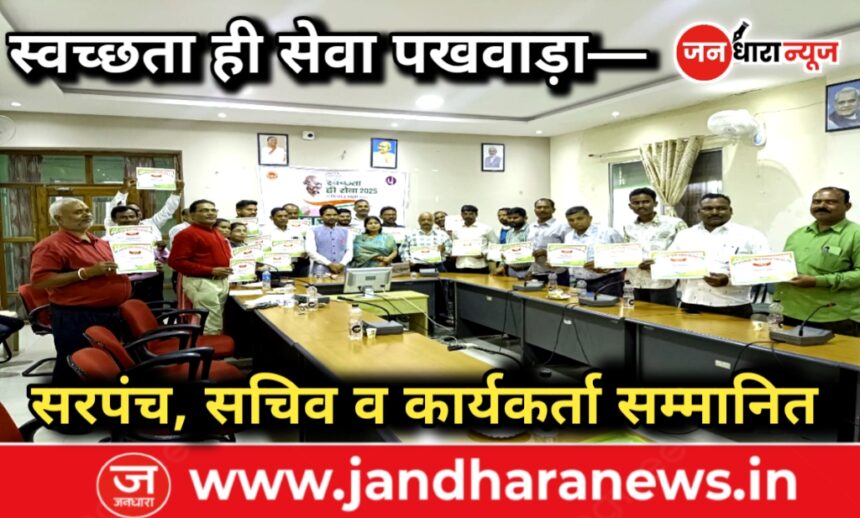 डिंडौरी। स्वच्छ भारत मिशन के अंतर्गत 17 सितम्बर से जिले में चल रहे स्वच्छता ही सेवा पखवाड़ा का समापन एवं सम्मान समारोह जिला पंचायत सभाकक्ष में आयोजित हुआ। कार्यक्रम में अध्यक्ष जिला पंचायत रूदेश परस्ते एवं उपाध्यक्ष अंजू व्योहार सहित विभिन्न विभागों के अधिकारी, कर्मचारी, ग्राम पंचायतों के प्रतिनिधि एवं स्वच्छता से जुड़े कार्यकर्ता बड़ी संख्या में उपस्थित रहे।
