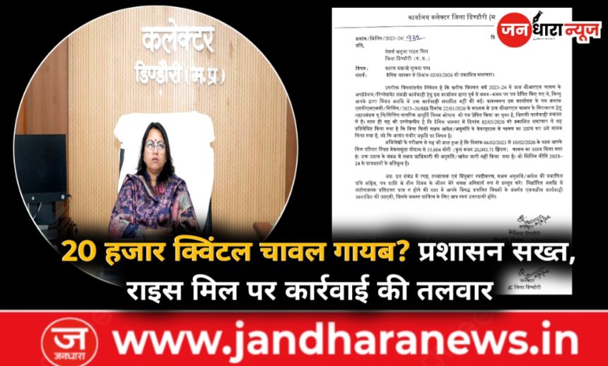 डिंडौरी। खरीफ विपणन वर्ष 2023-24 के अंतर्गत बीआरएल चावल के अपवर्जन/रिलीजमेंट प्रकरण में गंभीर अनियमितता सामने आने पर कलेक्टर ने मेसर्स खनूजा राइस मिल, डिंडौरी को कारण बताओ सूचना पत्र जारी किया है। मामला वेयरहाउस में रखे सड़े चावल से जुड़ी समाचार प्रकाशन के बाद प्रकाश में आया, जिसे प्रशासन ने गंभीरता से लिया।