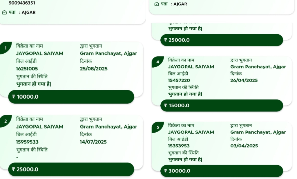 गौरतलब यह है कि ग्राम पंचायत अजगर में 5वें और 15वें वित्त से स्वीकृत लाखों रुपये सड़क निर्माण और विकास कार्यों में खर्च होने के बजाय निजी लाभ के लिए खर्च किए गए। भुगतान सामग्री खरीदी के नाम पर अपने पसंदीदा सप्लायर को राशि वितरित की गई, जबकि मजदूरों की कोई जानकारी रिकॉर्ड में दर्ज नहीं है और कागजों में निर्माण कर विकास निधि का बंदरवाट कर दिया गया है।