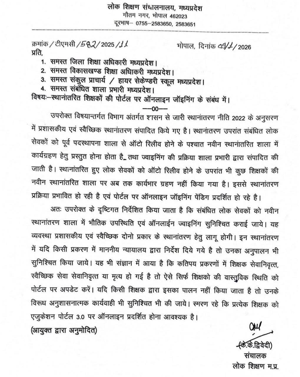 लोक शिक्षण संचालनालय ने सभी जिला शिक्षा अधिकारी, विकासखंड शिक्षा अधिकारी, संकुल प्राचार्य एवं शाला प्रभारियों को निर्देशित किया है कि वे संबंधित शिक्षकों की भौतिक उपस्थिति सुनिश्चित कराते हुए उनकी ऑनलाइन जॉइनिंग तत्काल पूर्ण कराएं। यह निर्देश प्रशासकीय और स्वैच्छिक दोनों प्रकार के स्थानांतरणों पर लागू होंगे। साथ ही जिन प्रकरणों में माननीय न्यायालय द्वारा निर्देश दिए गए हैं, उनका भी विधिवत पालन सुनिश्चित करने के निर्देश दिए गए हैं।