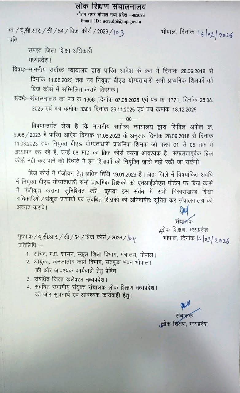 आदेश की प्रतिलिपि स्कूल शिक्षा विभाग के सचिव, जनजातीय कार्य विभाग के आयुक्त, सभी जिला कलेक्टरों तथा संभागीय संयुक्त संचालक लोक शिक्षण को आवश्यक कार्यवाही हेतु भेजी गई है। यह आदेश प्रदेश के हजारों प्राथमिक शिक्षकों के लिए अहम माना जा रहा है, क्योंकि अब ब्रिज कोर्स उनकी सेवा निरंतरता की अनिवार्य शर्त बन गया है।