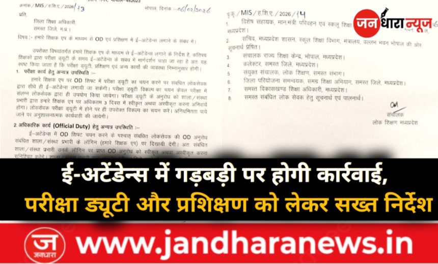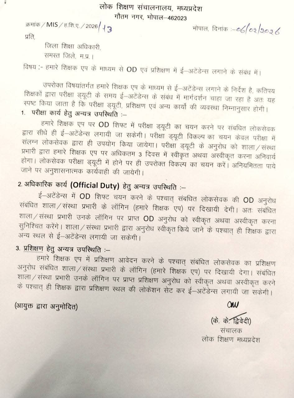 भोपाल। लोक शिक्षण संचालनालय, मध्यप्रदेश ने हमारे शिक्षक एप के माध्यम से ई-अटेंडेन्स को लेकर परीक्षा ड्यूटी, आधिकारिक कार्य (OD) और प्रशिक्षण में संलग्न शिक्षकों के लिए स्पष्ट दिशा-निर्देश जारी किए हैं। यह आदेश उन शिक्षकों की शंकाओं को दूर करने के लिए जारी किया गया है, जो परीक्षा ड्यूटी के दौरान ई-अटेंडेन्स को लेकर मार्गदर्शन मांग रहे थे।