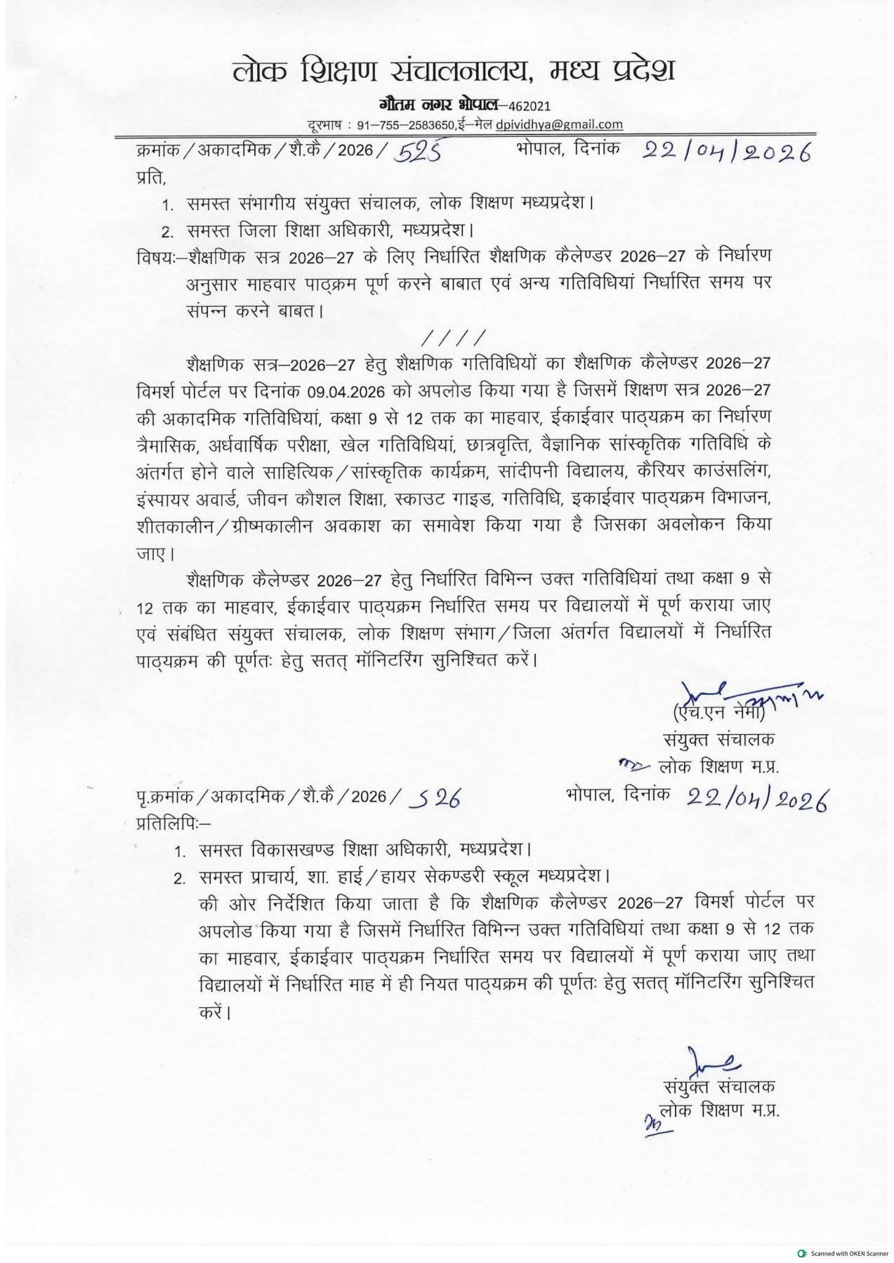भोपाल। लोक शिक्षण संचालनालय, मध्य प्रदेश ने शैक्षणिक सत्र 2026-27 के लिए शैक्षणिक कैलेंडर जारी कर दिया है। इस संबंध में 22 अप्रैल 2026 को जारी आदेश में प्रदेश के सभी संभागीय संयुक्त संचालकों और जिला शिक्षा अधिकारियों को निर्देश दिए गए हैं।