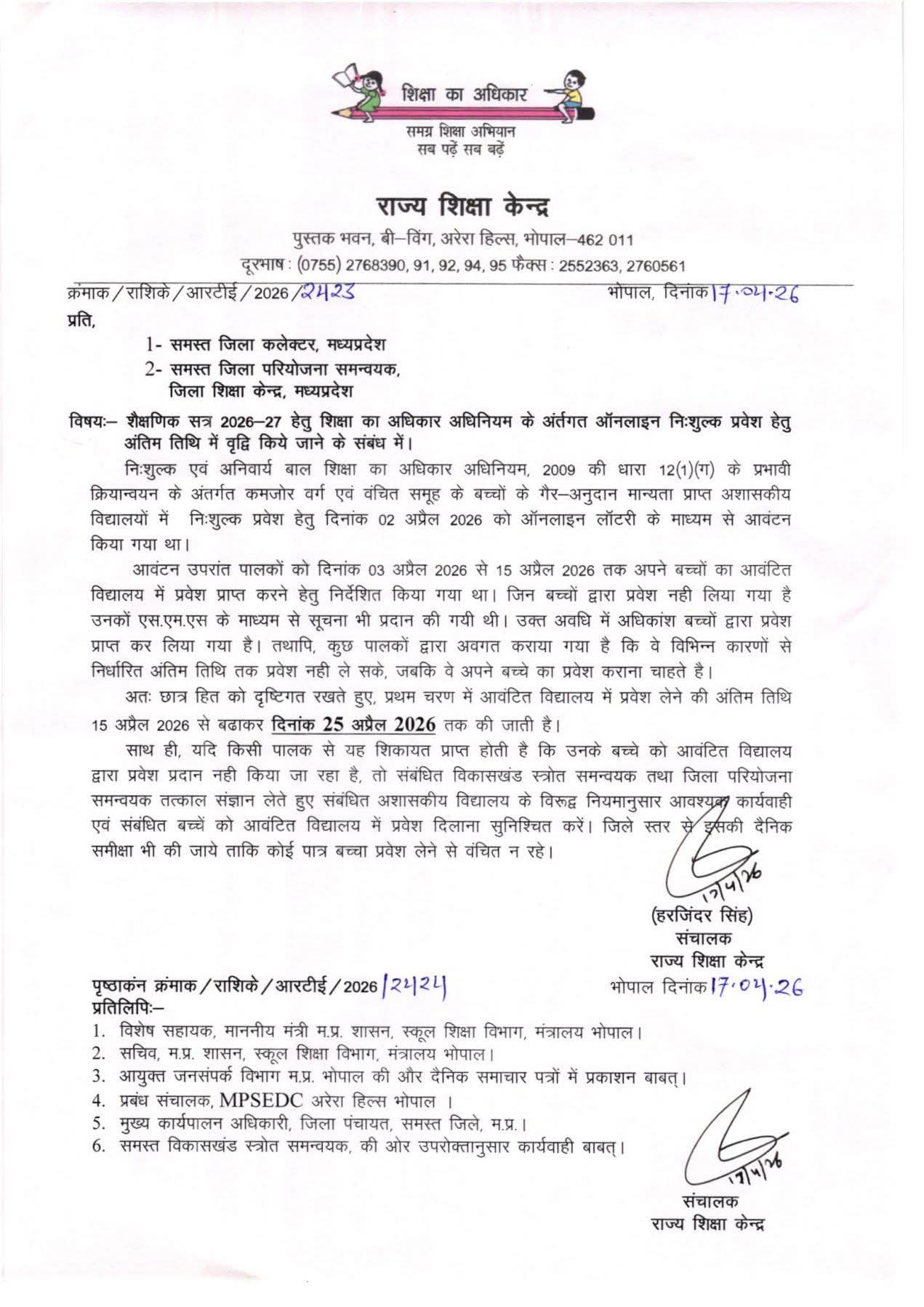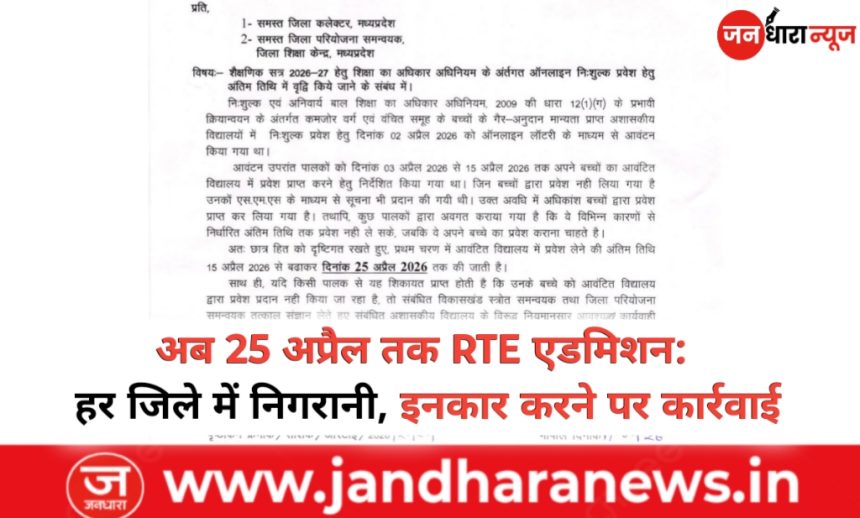 भोपाल। शैक्षणिक सत्र 2026-27 के अंतर्गत शिक्षा का अधिकार (RTE) अधिनियम के तहत निजी विद्यालयों में निःशुल्क प्रवेश प्रक्रिया को लेकर राज्य शिक्षा केन्द्र, भोपाल ने महत्वपूर्ण निर्णय लिया है। प्रथम चरण में चयनित विद्यार्थियों के प्रवेश की अंतिम तिथि 15 अप्रैल से बढ़ाकर अब 25 अप्रैल 2026 कर दी गई है।