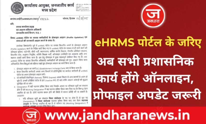 जनजातीय कार्य विभाग मध्यप्रदेश ने सभी कार्यालय प्रमुखों और आहरण संवितरण अधिकारियों को निर्देश दिए हैं कि विभागीय अमले का प्रोफाइल eHRMS पोर्टल पर अनिवार्य रूप से अद्यतन किया जाए और पोर्टल के माध्यम से वरिष्ठता सूची का संधारण, पदोन्नति, सीधी भर्ती, स्थानांतरण, वार्षिक संपत्ति विवरण, गोपनीय प्रतिवेदन, विभागीय जांच, अनुकंपा नियुक्ति, अतिथि शिक्षक भर्ती, ऑनलाइन उपस्थिति और अवकाश जैसे सभी प्रशासनिक कार्य किए जाएंगे आदेश में कहा गया है कि प्रोफाइल अद्यतन का कार्य EIC स्तर से किया जाएगा।