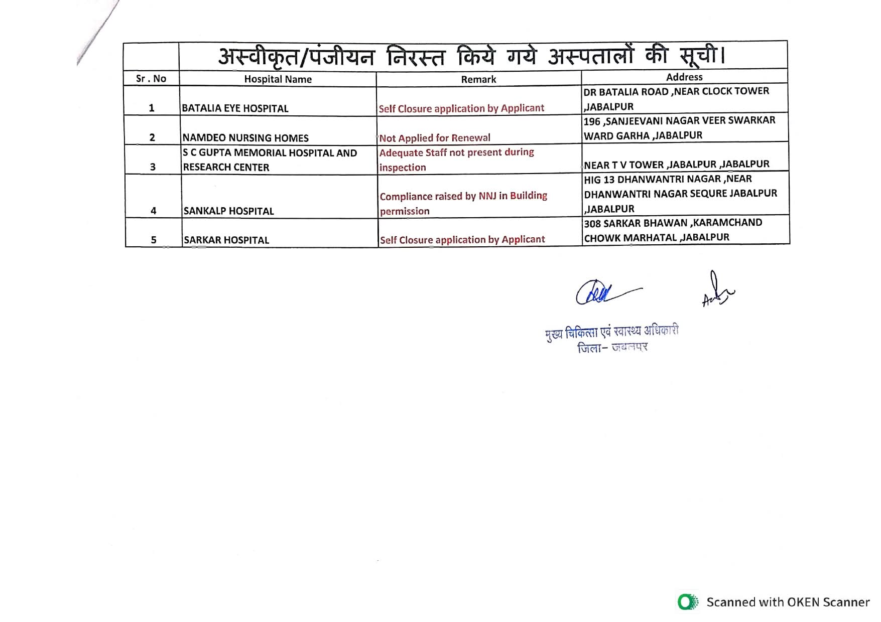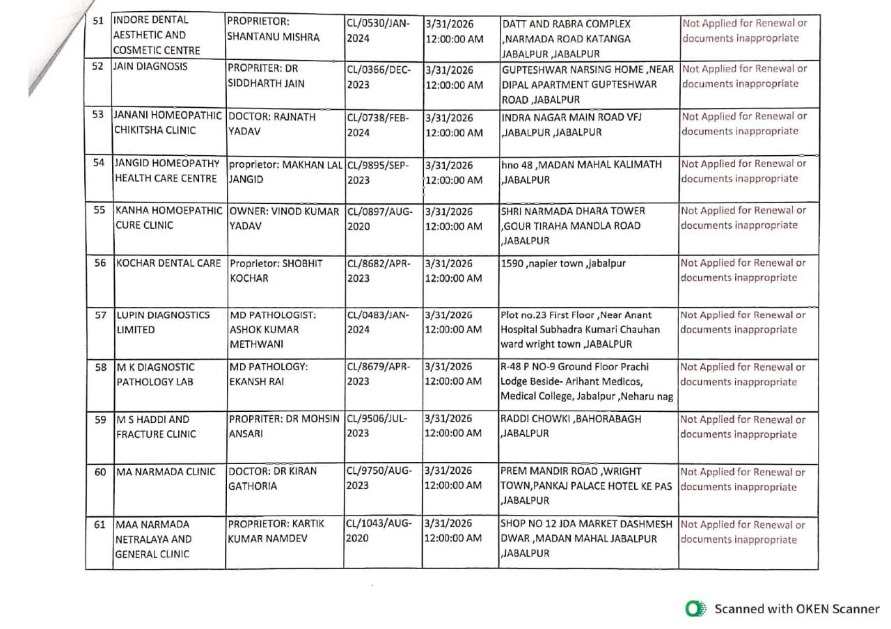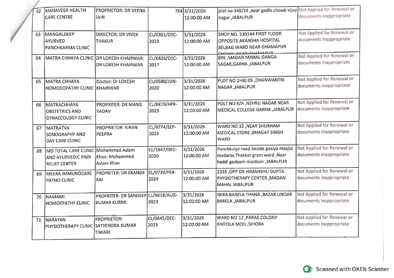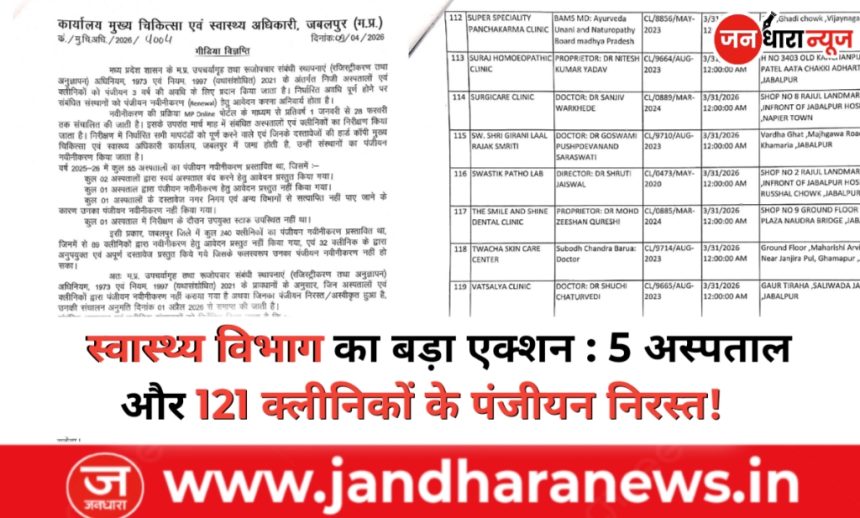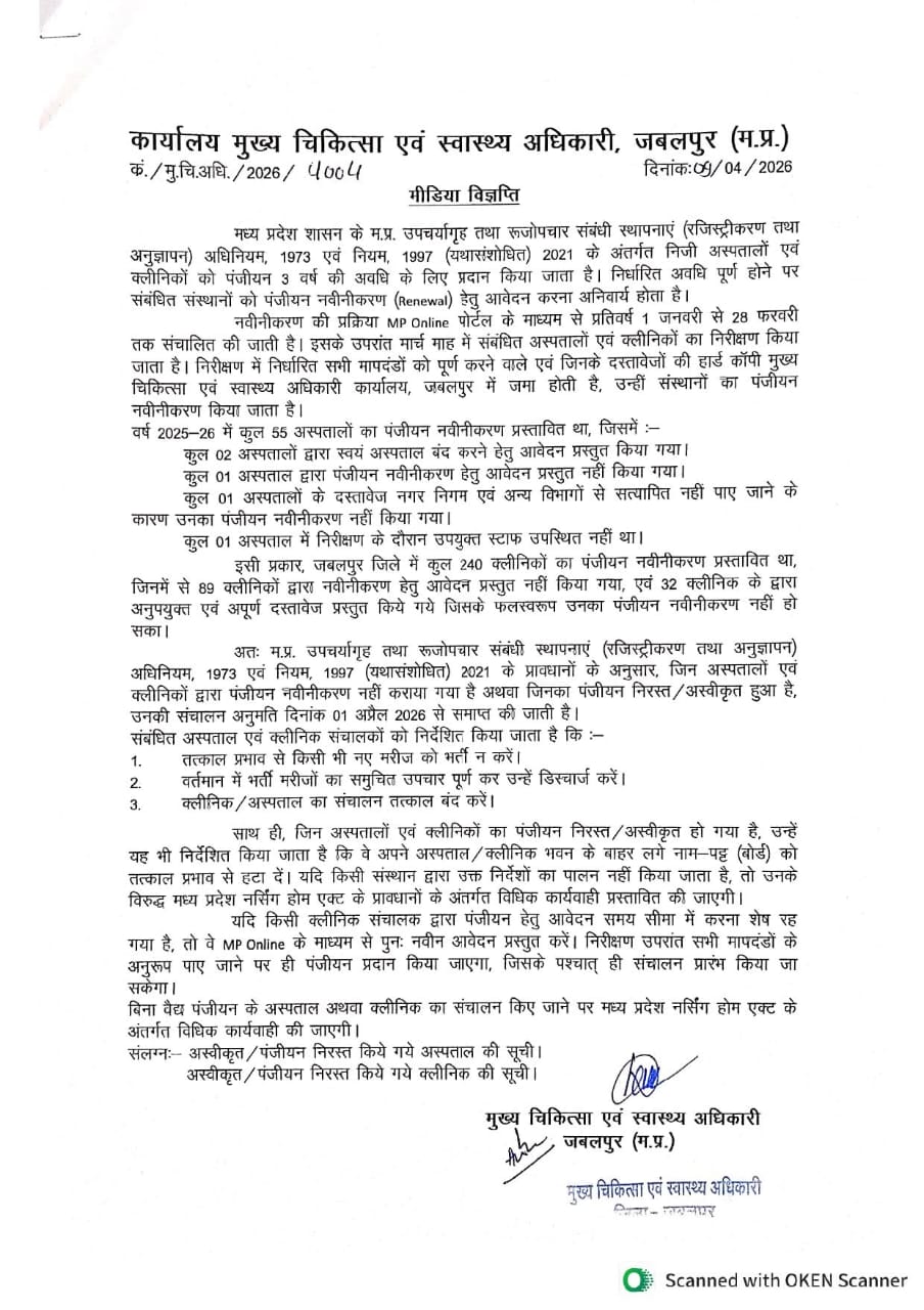 मध्यप्रदेश के जबलपुर में मुख्य चिकित्सा एवं स्वास्थ्य अधिकारी कार्यालय, जबलपुर ने निजी अस्पतालों एवं क्लीनिकों के पंजीयन नवीनीकरण को लेकर बड़ा आदेश जारी किया है। म.प्र. उपचर्यागृह एवं रुजोपचार संबंधी स्थापनाएं (रजिस्ट्रीकरण एवं अनुज्ञापन) अधिनियम, 1973 और नियम 1997 (यथासंशोधित 2021) के तहत पंजीयन नवीनीकरण प्रक्रिया पूरी न करने वाले संस्थानों पर सख्त कार्रवाई की गई है।