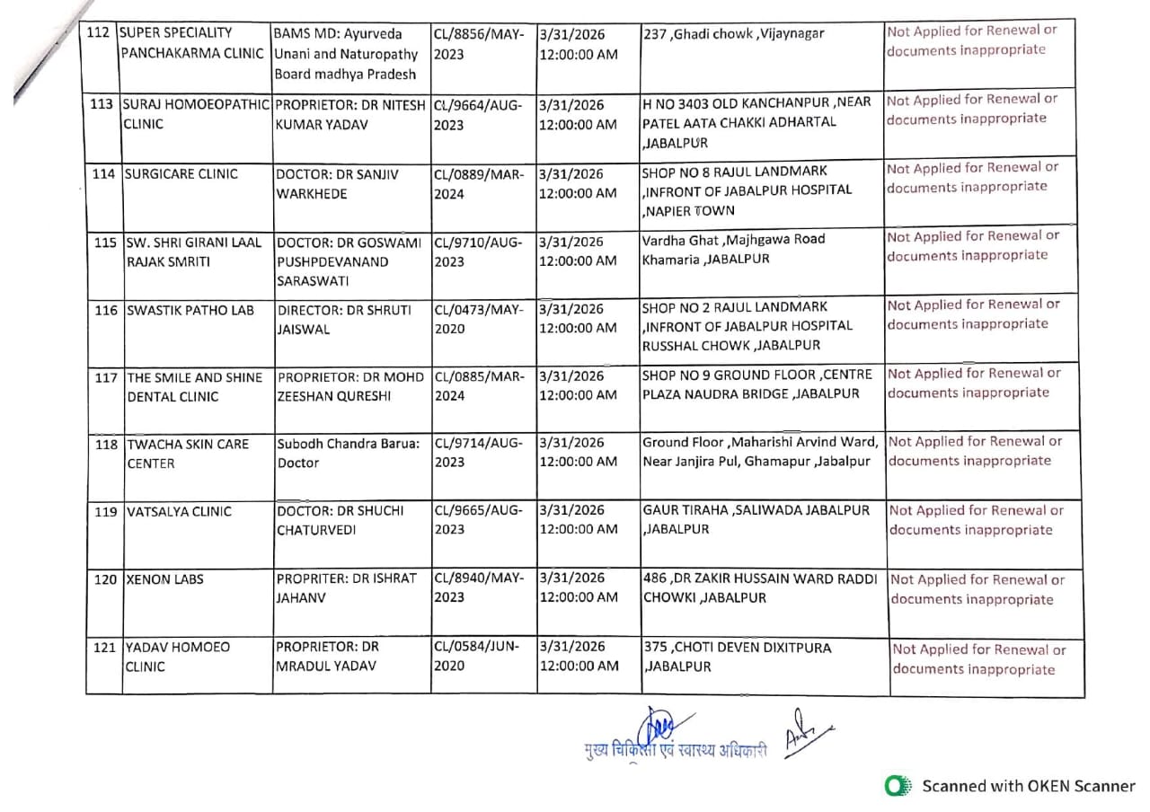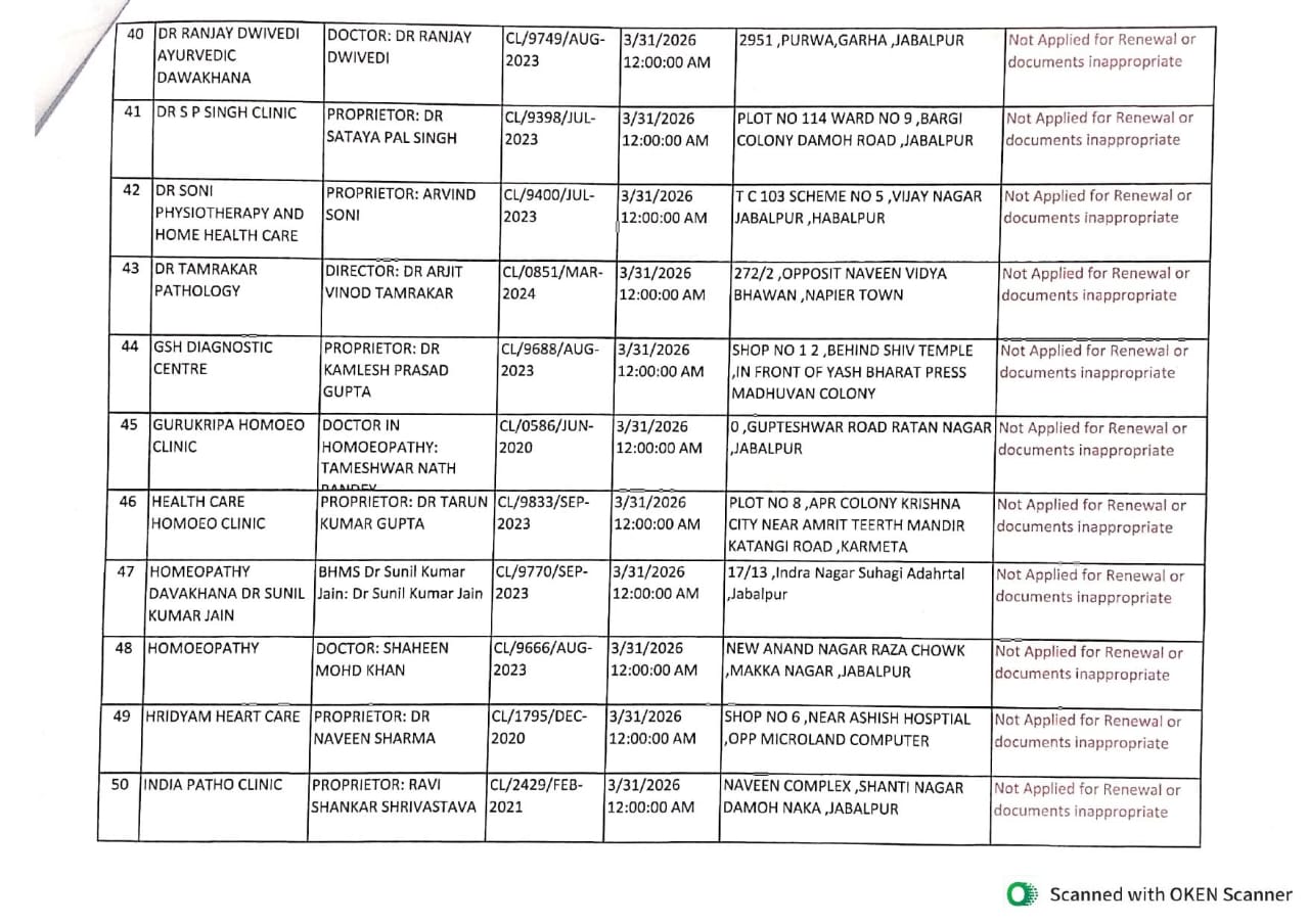संबंधित संचालकों को निर्देश दिए गए हैं कि वे तत्काल नए मरीजों को भर्ती न करें, वर्तमान मरीजों का उपचार पूर्ण कर डिस्चार्ज करें और अपने संस्थान का संचालन बंद करें। साथ ही, अस्पताल/क्लीनिक के बाहर लगे नाम-पट्ट (बोर्ड) को भी हटाने के निर्देश दिए गए हैं। निर्देशों का पालन न करने की स्थिति में मध्य प्रदेश नर्सिंग होम एक्ट के तहत विधिक कार्रवाई की चेतावनी दी गई है। वहीं, जिन संचालकों से आवेदन छूट गया है, वे MP Online पोर्टल के माध्यम से पुनः आवेदन कर सकते हैं। देखें पूरी लिस्ट…