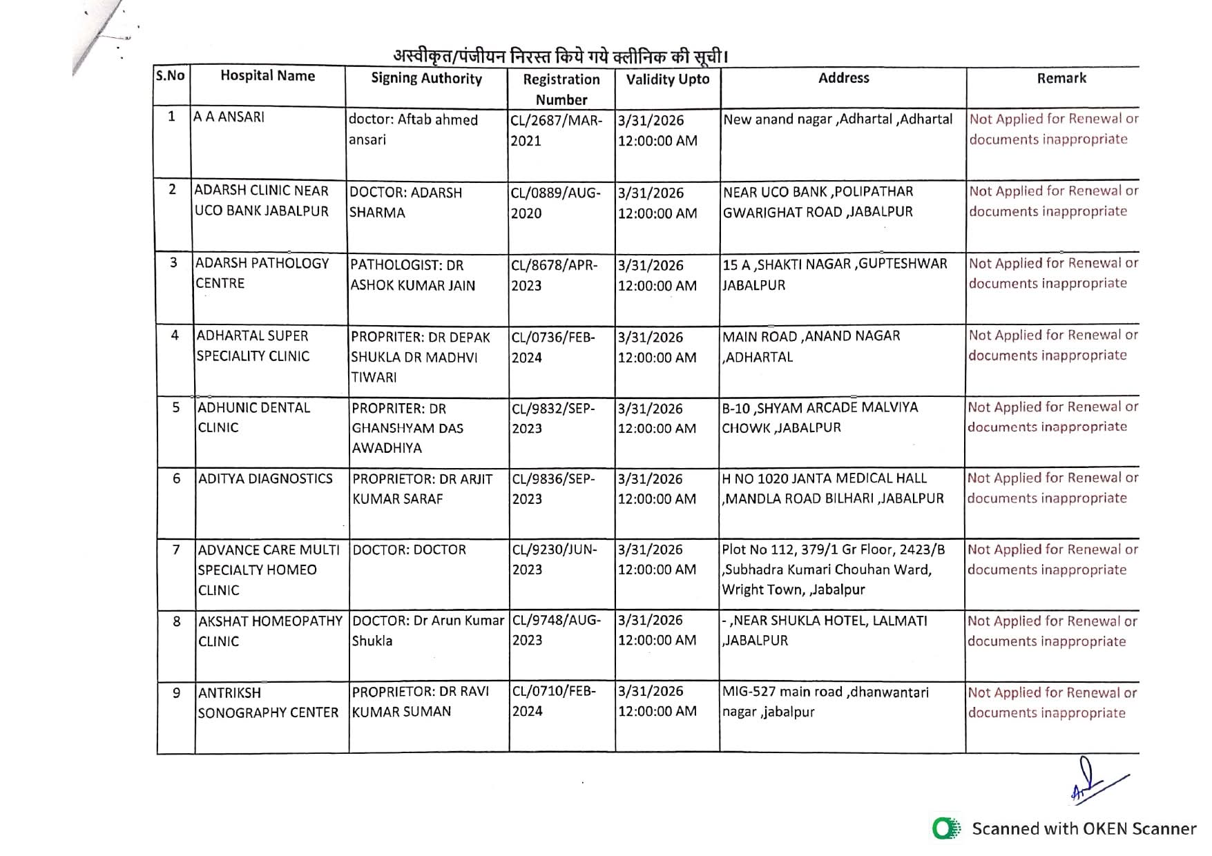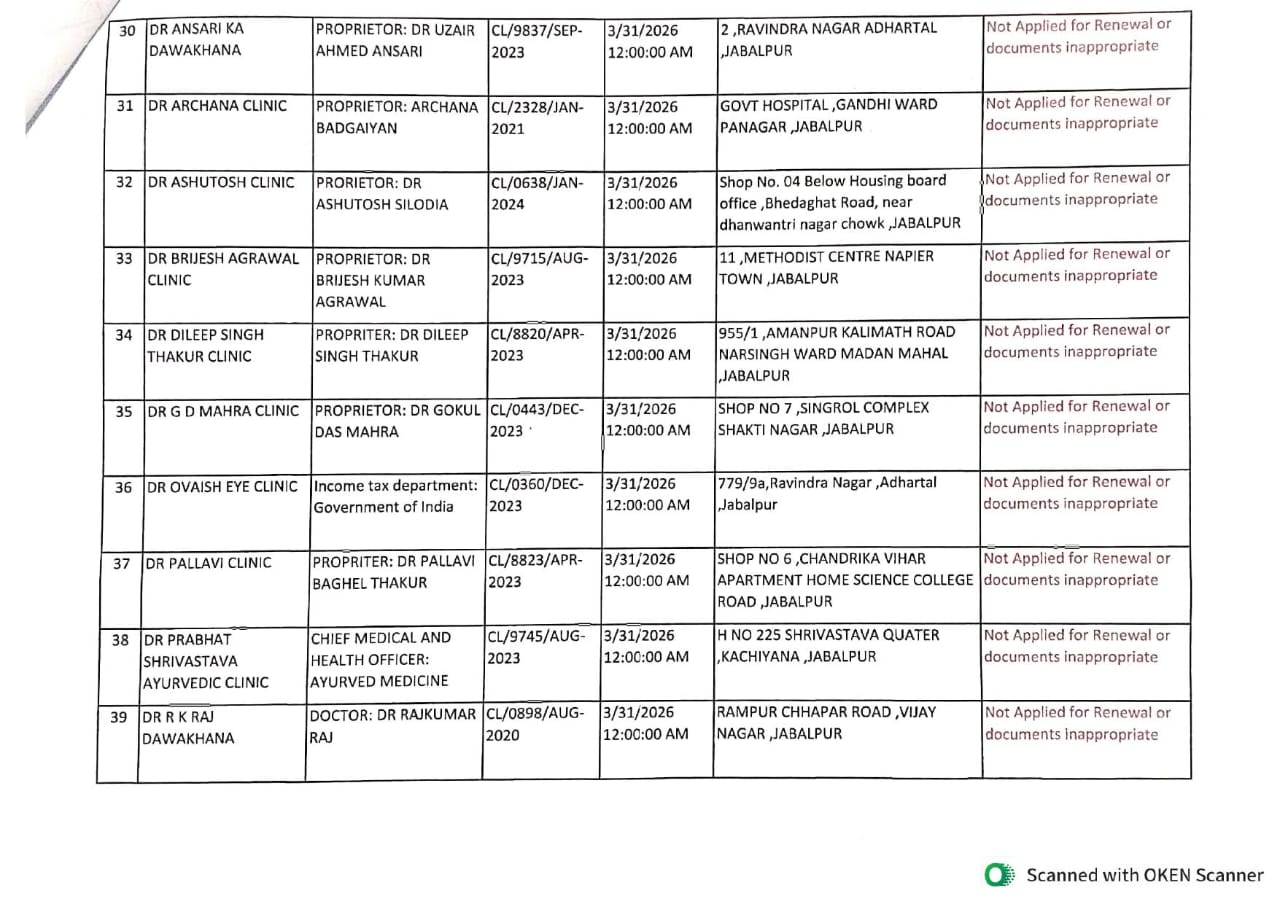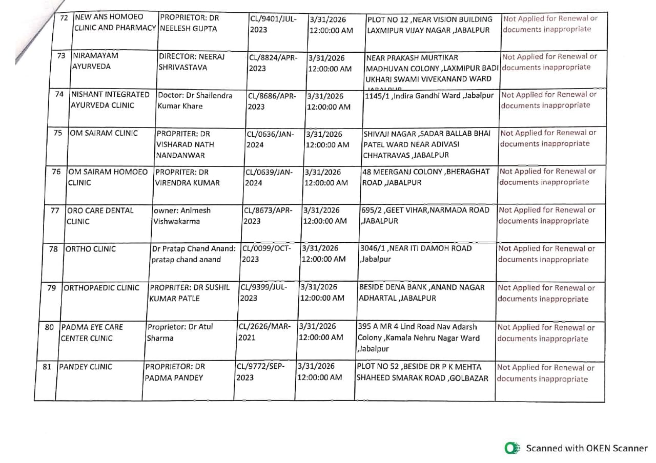 इसी प्रकार जिले के 240 क्लीनिकों में से 89 क्लीनिकों ने नवीनीकरण हेतु आवेदन नहीं किया, जबकि 32 क्लीनिकों के दस्तावेज अपूर्ण या अनुपयुक्त पाए गए, जिसके कारण उनका भी पंजीयन नवीनीकरण नहीं हो सका। वहीं प्रशासन ने स्पष्ट किया है कि जिन अस्पतालों एवं क्लीनिकों का पंजीयन नवीनीकरण नहीं हुआ है या निरस्त/अस्वीकृत किया गया है, उनका संचालन 01 अप्रैल 2026 से पूर्णतः बंद माना जाएगा।
