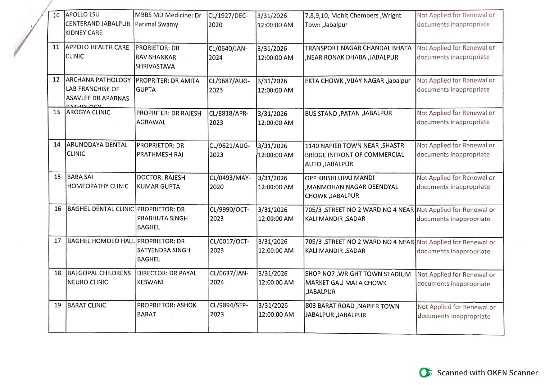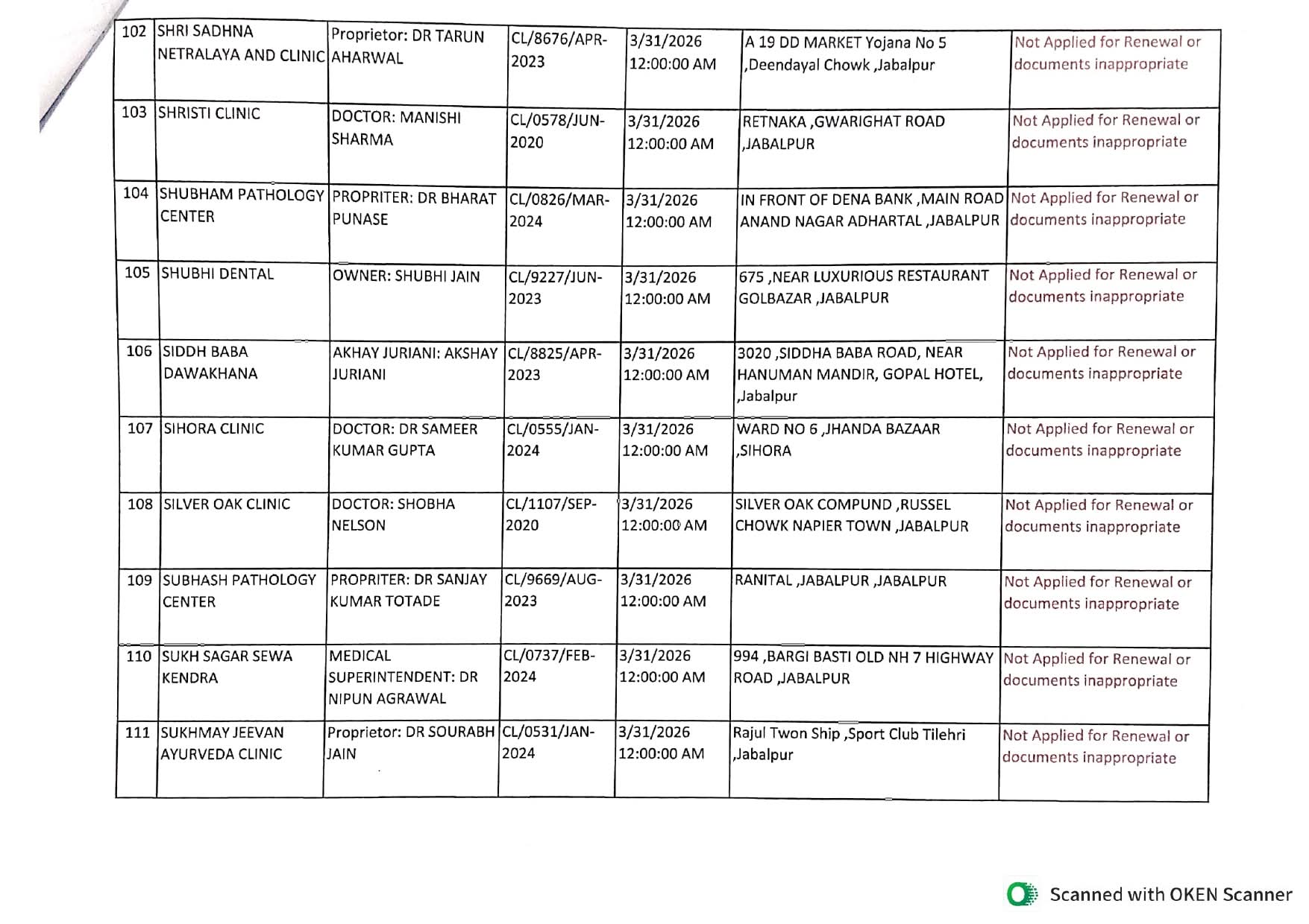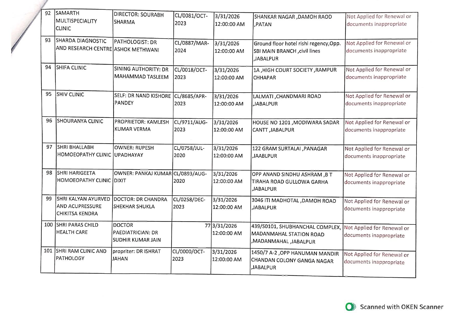 इसी प्रकार जिले के 240 क्लीनिकों में से 89 क्लीनिकों ने नवीनीकरण हेतु आवेदन नहीं किया, जबकि 32 क्लीनिकों के दस्तावेज अपूर्ण या अनुपयुक्त पाए गए, जिसके कारण उनका भी पंजीयन नवीनीकरण नहीं हो सका। वहीं प्रशासन ने स्पष्ट किया है कि जिन अस्पतालों एवं क्लीनिकों का पंजीयन नवीनीकरण नहीं हुआ है या निरस्त/अस्वीकृत किया गया है, उनका संचालन 01 अप्रैल 2026 से पूर्णतः बंद माना जाएगा।