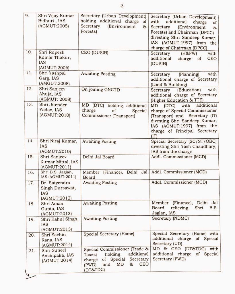जारी तबादला सूची के अनुसार इस बड़े फेरबदल में 34 आईएएस अधिकारी शामिल हैं, जबकि शेष अधिकारी DANICS संवर्ग से हैं। कुल मिलाकर 72 अधिकारियों की जिम्मेदारियों में बदलाव किया गया है। समाज कल्याण, गृह, सतर्कता, शहरी विकास, पर्यावरण, शिक्षा, स्वास्थ्य, परिवहन, बिजली, राजस्व, नगर निगम, दिल्ली जल बोर्ड और एनडीएमसी जैसे महत्वपूर्ण विभागों में नए सिरे से पदस्थापना की गई है।