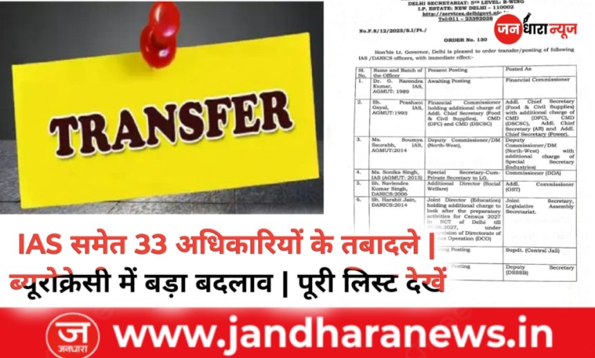 नई दिल्ली। दिल्ली सरकार ने प्रशासनिक व्यवस्था को और अधिक सुदृढ़ करने के उद्देश्य से बड़े पैमाने पर तबादले और पदस्थापना आदेश जारी किए हैं। सर्विसेज डिपार्टमेंट द्वारा जारी आदेश क्रमांक 130 (दिनांक 8 अप्रैल 2026) के तहत 33 IAS और DANICS अधिकारियों को तत्काल प्रभाव से नई जिम्मेदारियां सौंपी गई हैं।