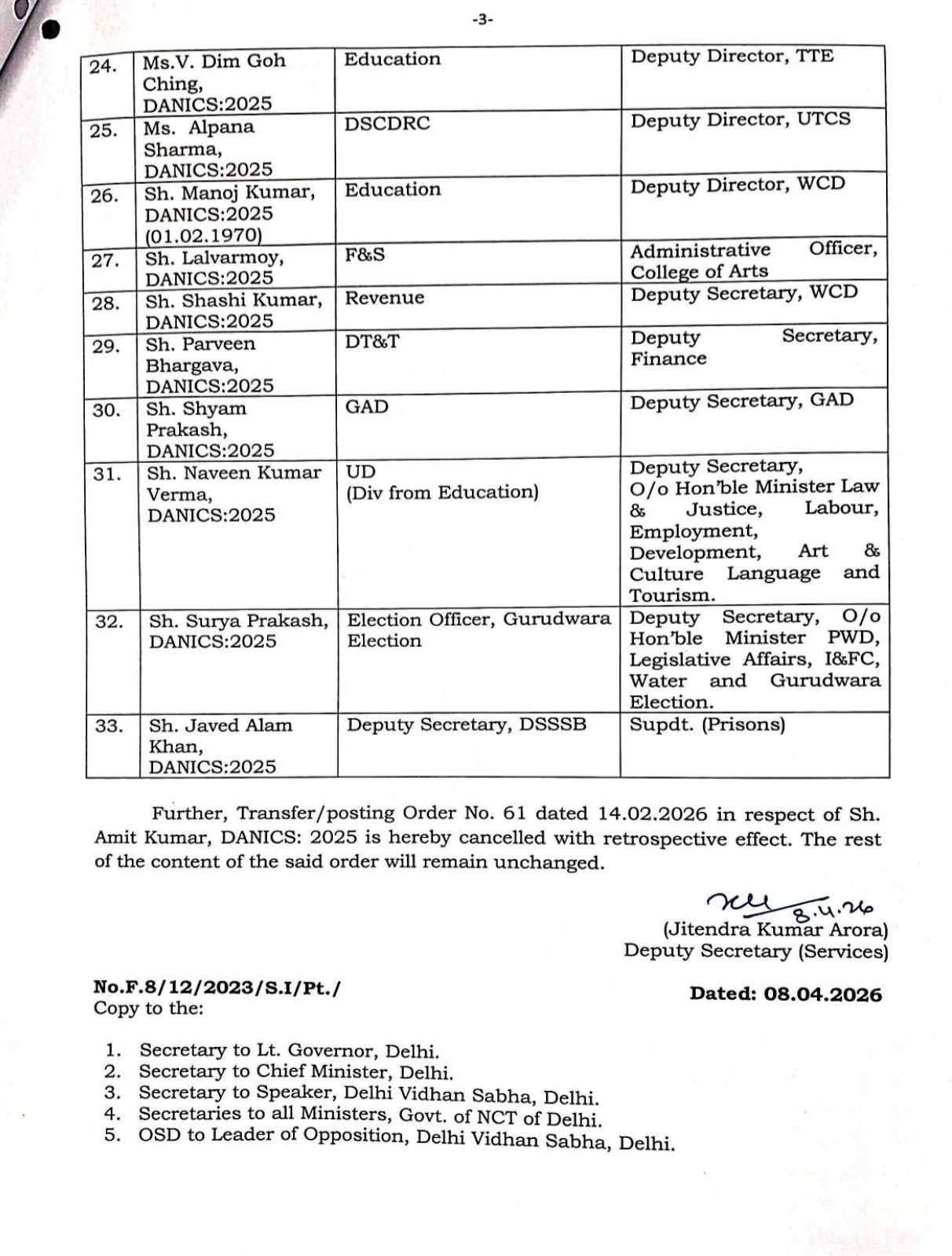 मध्यम स्तर के आईएएस अधिकारियों में भी महत्वपूर्ण बदलाव किए गए हैं। सौम्या सौरभ को डिप्टी कमिश्नर (नॉर्थ-वेस्ट) के पद पर यथावत रखते हुए उद्योग विभाग में विशेष सचिव का अतिरिक्त प्रभार दिया गया है। वहीं सोनिका सिंह को एलजी के विशेष सचिव एवं निजी सचिव पद से हटाकर दिल्ली विकास प्राधिकरण (DDA) में कमिश्नर बनाया गया है।