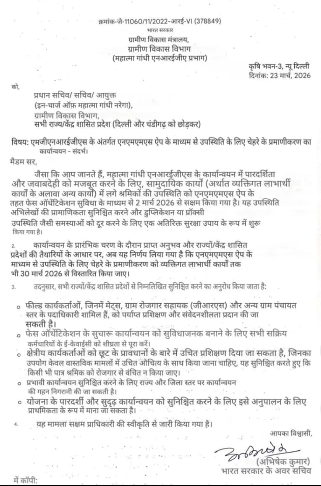 मंत्रालय ने यह भी स्पष्ट किया है कि इस व्यवस्था के प्रभावी क्रियान्वयन के लिए राज्य और जिला स्तर पर नियमित निगरानी सुनिश्चित की जाएगी और इसे प्राथमिकता के साथ लागू करना होगा। यह आदेश कृषि भवन, नई दिल्ली से सक्षम प्राधिकारी की स्वीकृति के साथ जारी किया गया है, जिस पर भारत सरकार के अवर सचिव अभिषेक कुमार के हस्ताक्षर हैं। देखें आदेश…