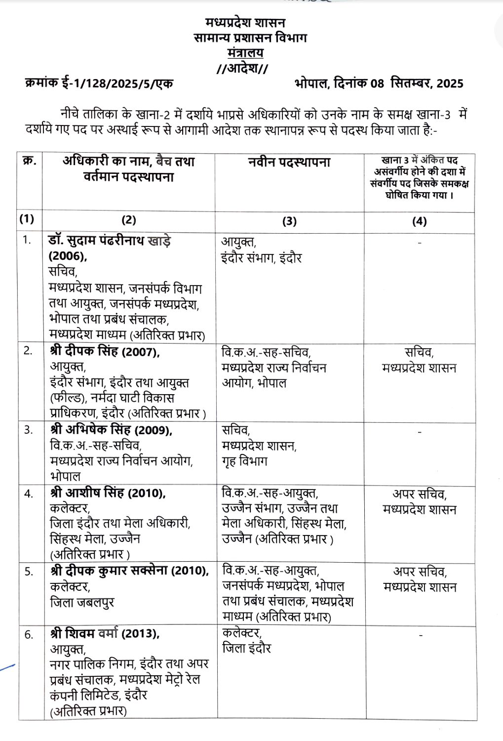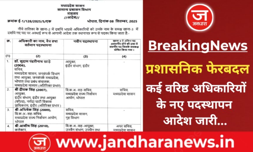 भोपाल : मध्यप्रदेश शासन सामान्य प्रशासन विभाग ने आज बड़े पैमाने पर प्रशासनिक फेरबदल करते हुए कई वरिष्ठ अधिकारियों के पदस्थापन आदेश जारी किए हैं। आदेश के अनुसार, कई अधिकारियों को उनके वर्तमान पदों से स्थानांतरित कर नई जिम्मेदारियों के साथ अस्थाई रूप से पदस्थ किया गया है।