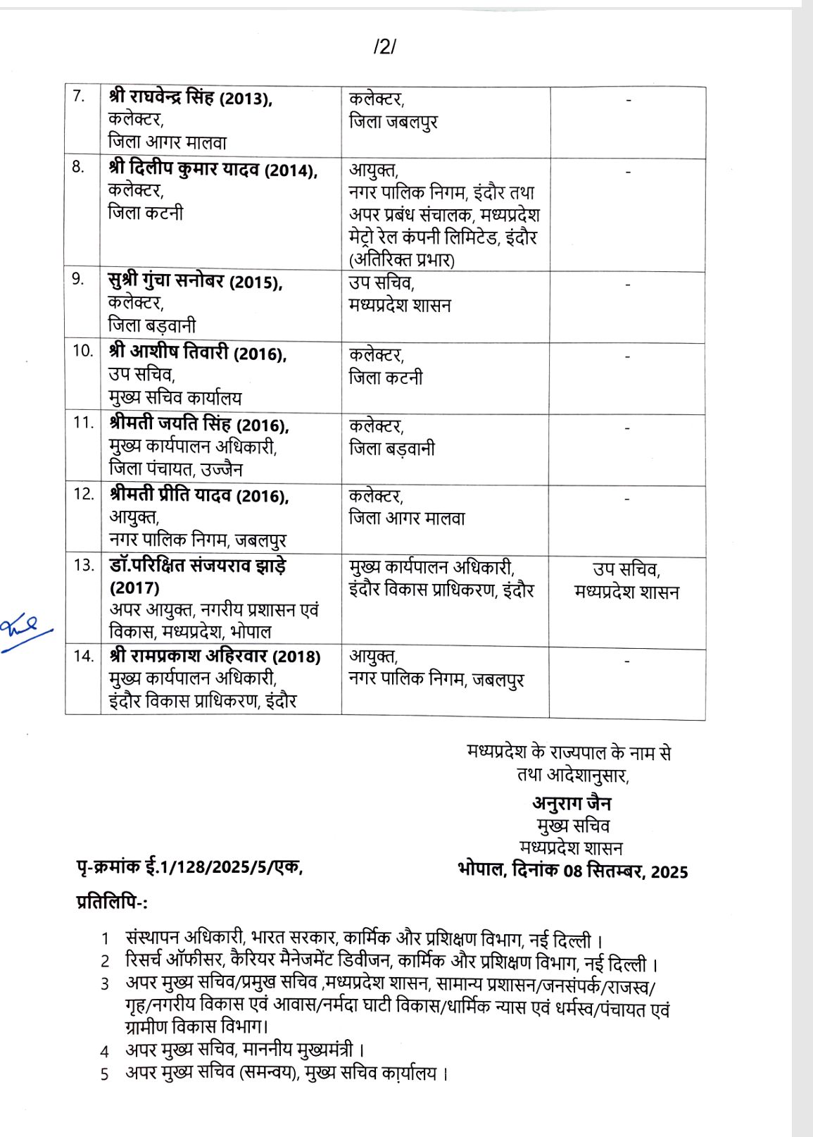 इसके अलावा, राघवेन्द्र सिंह, दिलीप कुमार यादव, गुंचा सनोबर, आशीष तिवारी, जयति सिंह, प्रीति यादव, परिक्षित संजयराव झाड़े और रामप्रकाश अहिरवार को भी नए पदों पर अस्थाई रूप से स्थानांतरित किया गया है।