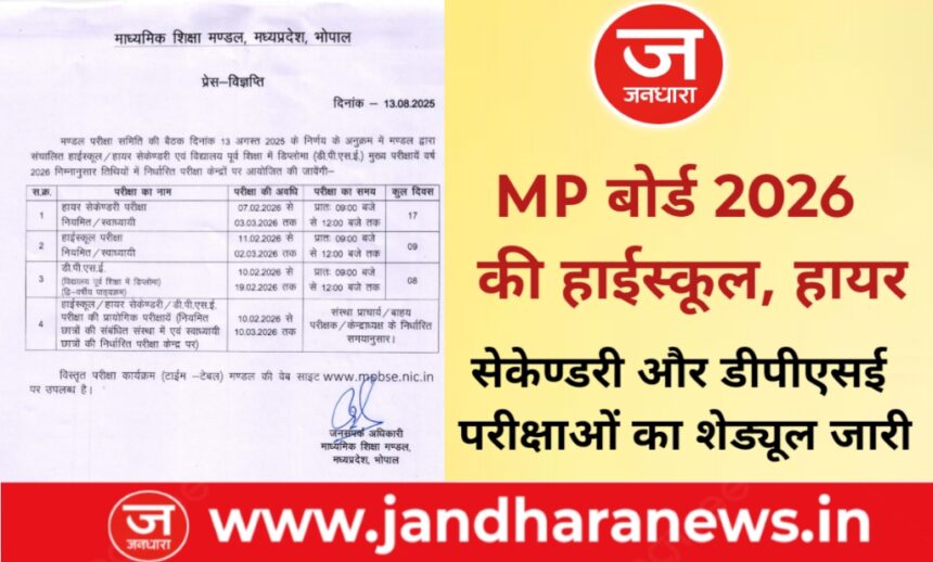 भोपाल। माध्यमिक शिक्षा मंडल मध्यप्रदेश द्वारा, मण्डल परीक्षा समिति की बैठक दिनांक 13 अगस्त 2025 के निर्णय के अनुक्रम में मण्डल द्वारा संचालित हाईस्कूल / हायर सेकेण्डरी एवं विद्यालय पूर्व शिक्षा में डिप्लोमा (डी.पी.एस.ई.) मुख्य परीक्षायें वर्ष 2026 की तिथियां घोषित की हैं।