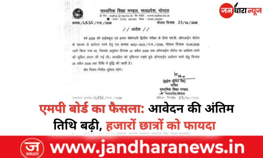 भोपाल। माध्यमिक शिक्षा मंडल मध्यप्रदेश ने वर्ष 2026 की हाईस्कूल एवं हायर सेकेंडरी द्वितीय परीक्षा के लिए ऑनलाइन आवेदन की अंतिम तिथि बढ़ा दी है। जारी आदेश के अनुसार अब विद्यार्थी 26 अप्रैल 2026 तक एमपी ऑनलाइन पोर्टल के माध्यम से आवेदन कर सकेंगे।