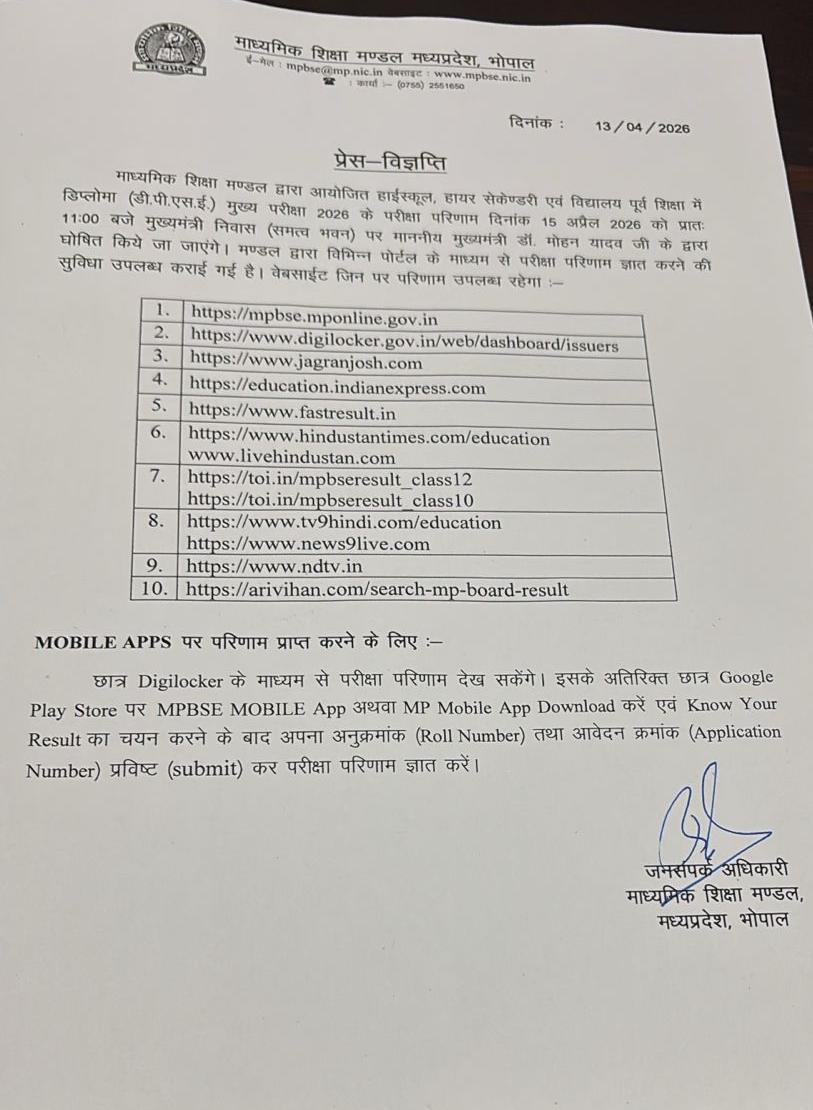 बता दें कि बोर्ड ने छात्रों की सुविधा को ध्यान में रखते हुए विभिन्न वेबसाइट्स और डिजिट प्लेटफॉर्म पर परिणाम देखने की व्यवस्था की है। छात्र mpbse.mponline.gov.in, DigiLocker सहित अन्य पोर्टल्स पर अपना रिजल्ट देख सकेंगे।