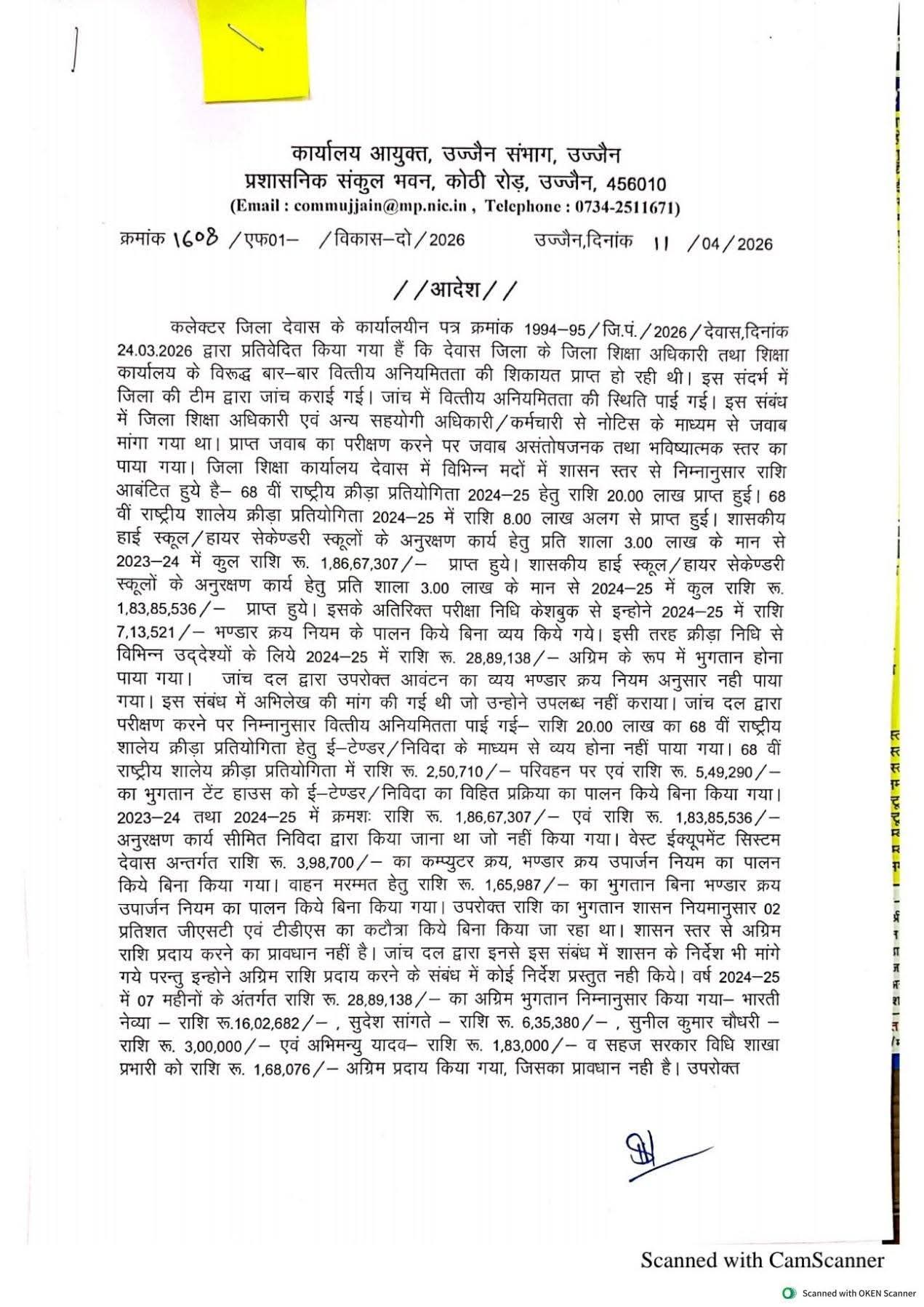 दरअसल विभाग द्वारा जारी आदेश में उल्लेख किया गया है कि जिला शिक्षा कार्यालय देवास के विरुद्ध लगातार वित्तीय अनियमितताओं की शिकायतें मिल रही थीं, जिसके बाद जांच कराई गई। जांच में पाया गया कि विभिन्न योजनाओं के तहत प्राप्त शासकीय राशि का व्यय निर्धारित भंडार क्रय और निविदा नियमों का पालन किए बिना किया गया। 68वीं राष्ट्रीय शालेय क्रीड़ा प्रतियोगिता 2024-25 के लिए प्राप्त राशि का उपयोग भी ई-टेंडर प्रक्रिया के बिना किया गया, जिसमें परिवहन और टेंट जैसी व्यवस्थाओं पर लाखों रुपए खर्च किए गए।