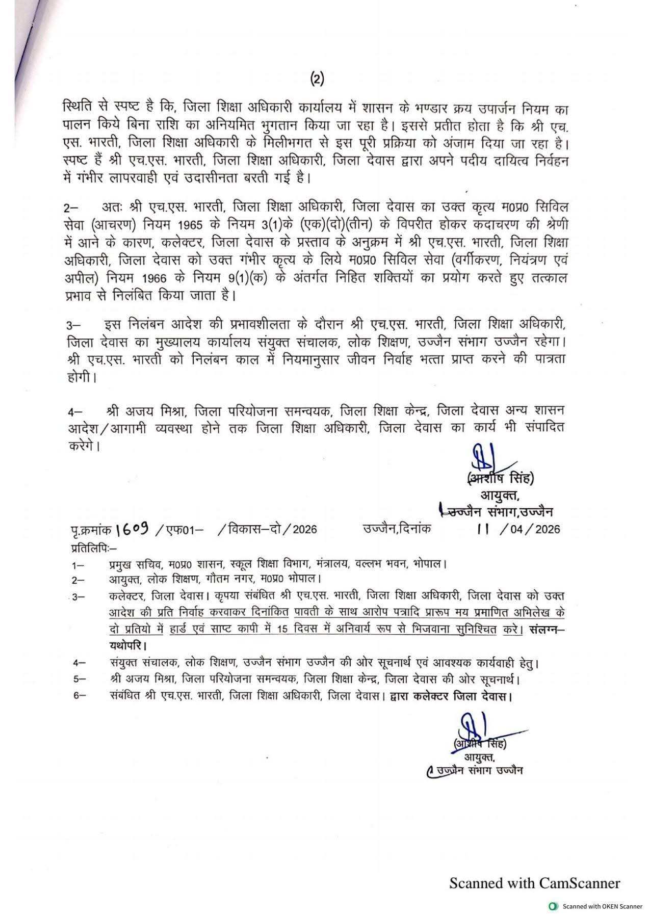 मध्यप्रदेश के उज्जैन संभाग के आयुक्त द्वारा जारी आदेश के अनुसार देवास जिला शिक्षा अधिकारी एच.एस. भारती को गंभीर वित्तीय अनियमितताओं के चलते तत्काल प्रभाव से निलंबित कर दिया गया है। यह कार्रवाई कलेक्टर देवास के प्रतिवेदन और जिला स्तरीय जांच में सामने आई गड़बड़ियों के आधार पर की गई है।