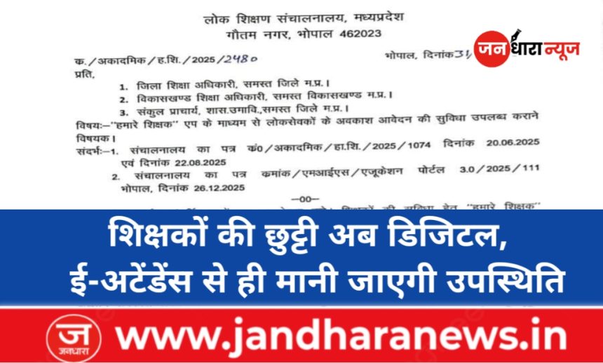 भोपाल। लोक शिक्षण संचालनालय, मध्यप्रदेश ने स्कूल शिक्षा विभाग में कार्यरत समस्त लोकसेवकों के लिए अवकाश आवेदन की प्रक्रिया को पूरी तरह ऑनलाइन कर दिया है। अब दिनांक 01 जनवरी 2026 से सभी प्रकार के अवकाश आवेदन “हमारे शिक्षक” एप के माध्यम से ही स्वीकार किए जाएंगे, ऑफलाइन आवेदन मान्य नहीं होंगे।