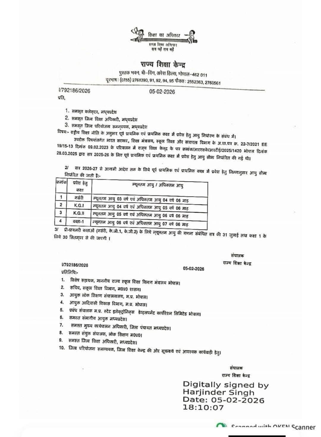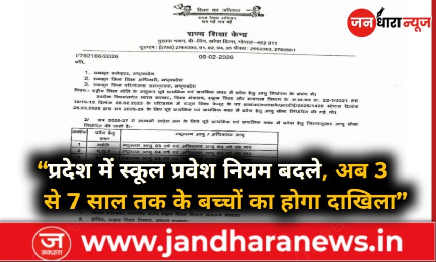 भोपाल। राज्य शिक्षा केन्द्र ने आगामी शैक्षणिक सत्र 2026-27 के लिए पूर्व-प्राथमिक और प्राथमिक कक्षा में प्रवेश हेतु आयु सीमा निर्धारित कर दी है। यह आदेश भारत सरकार के शिक्षा मंत्रालय के निर्देशानुसार सभी कलेक्टरों, जिला शिक्षा अधिकारियों और जिला परियोजना समन्वयकों को भेजा गया है।