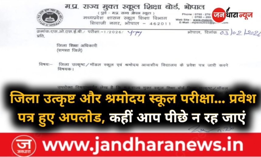 भोपाल। म.प्र. राज्य मुक्त स्कूल शिक्षा बोर्ड, भोपाल द्वारा जिला उत्कृष्ट/मॉडल स्कूल एवं श्रमोदय आवासीय विद्यालय की प्रवेश चयन परीक्षा 08 फरवरी 2026 को आयोजित की जाएगी। परीक्षा में शामिल होने वाले विद्यार्थियों के प्रवेश पत्र जारी कर दिए गए हैं।