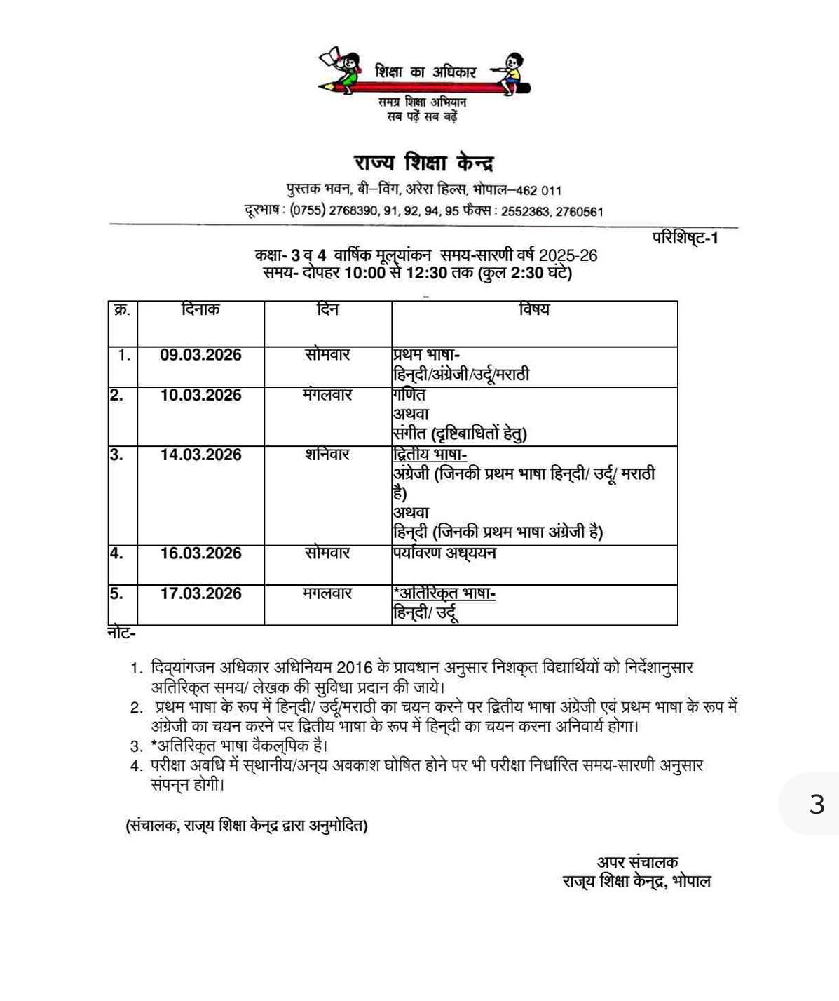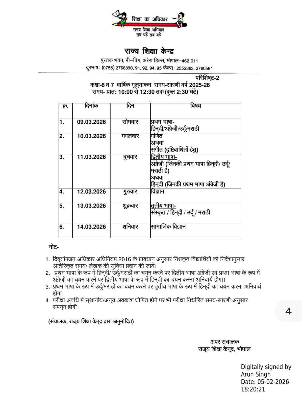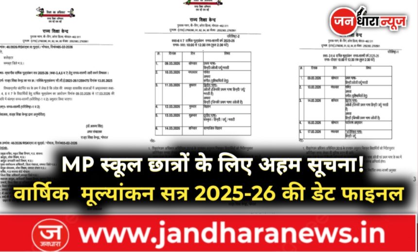 भोपाल। राज्य शिक्षा केन्द्र, भोपाल ने शिक्षा का अधिकार एवं समग्र शिक्षा अभियान के अंतर्गत प्रदेश की शासकीय शालाओं में अध्ययनरत विद्यार्थियों के लिए स्थानीय वार्षिक मूल्यांकन सत्र 2025-26 की समय-सारणी जारी कर दी है। यह मूल्यांकन कक्षा 3, 4, 6 एवं 7 के विद्यार्थियों के लिए आयोजित किया जाएगा।