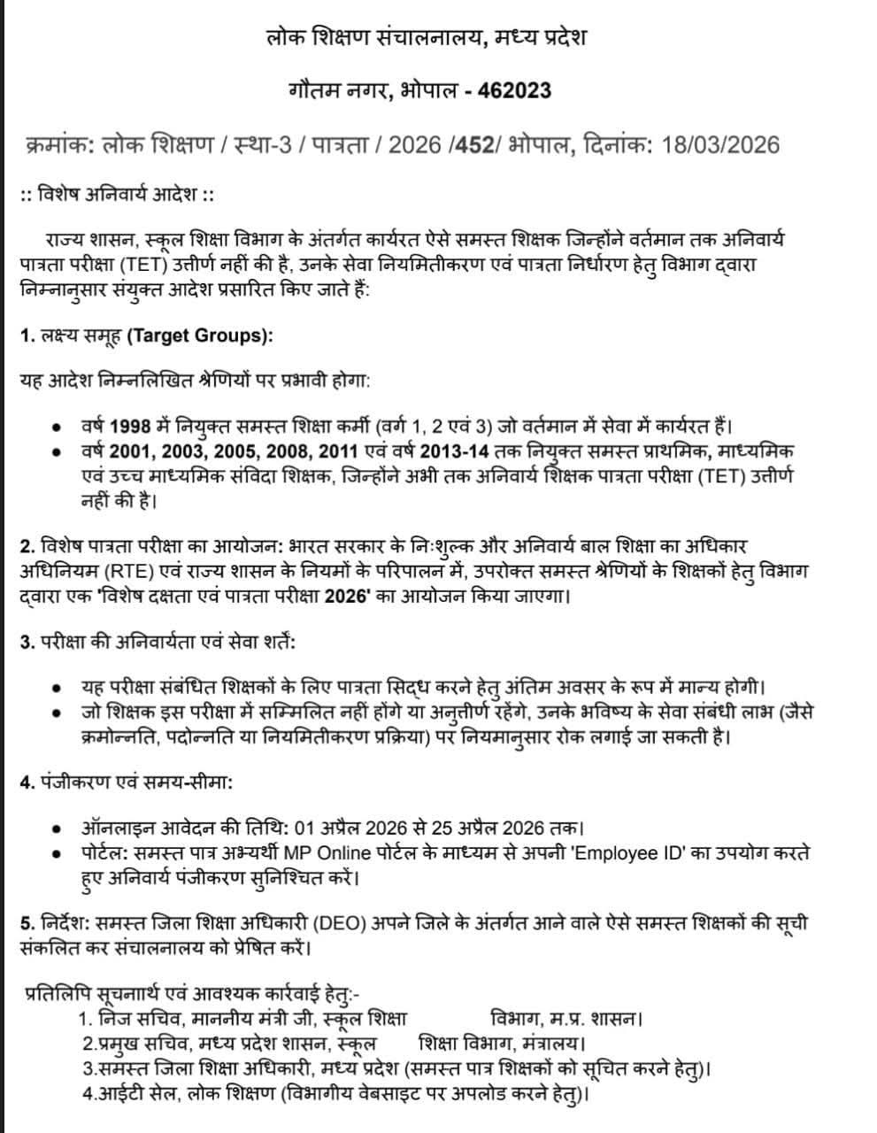 ऑनलाइन पंजीकरण 01 अप्रैल 2026 से 25 अप्रैल 2026 तक MP Online पोर्टल पर उपलब्ध होगा। समस्त जिला शिक्षा अधिकारियों को अपने जिले के शिक्षकों की सूची संकलित कर संचालनालय को भेजने के निर्देश दिए गए हैं। लोक शिक्षण संचालनालय ने सभी शिक्षकों से अपील की है कि वे समय पर पंजीकरण सुनिश्चित करें और इस अनिवार्य परीक्षा में शामिल हों, ताकि उनके सेवा लाभ सुरक्षित रह सकें। देखें आदेश….