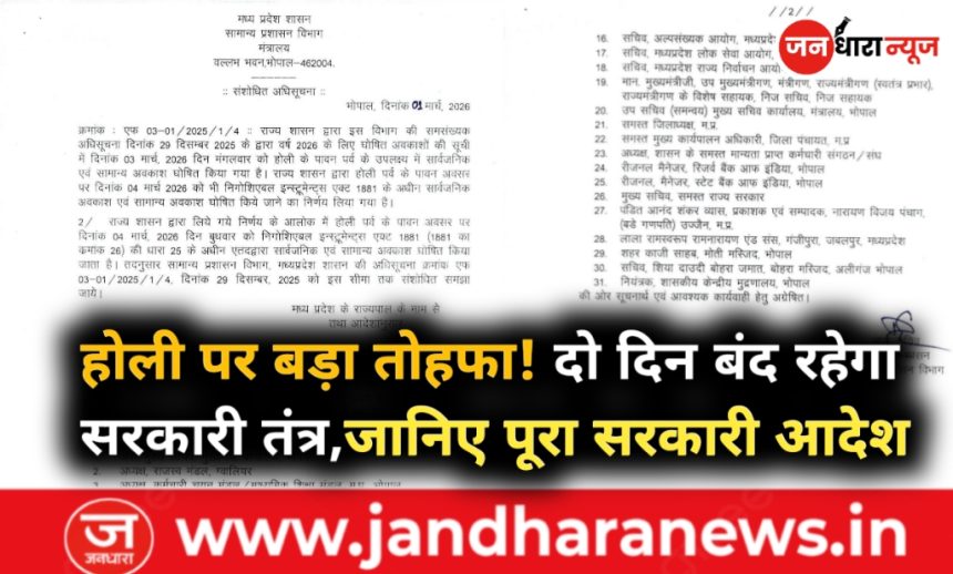 भोपाल। होली पर्व को लेकर मध्यप्रदेश में अवकाश संबंधी बड़ा फैसला लिया गया है। बता दें कि मध्य प्रदेश शासन सामान्य प्रशासन विभाग ने संशोधित अधिसूचना जारी करते हुए 04 मार्च 2026, दिन बुधवार को भी सार्वजनिक एवं सामान्य अवकाश घोषित कर दिया है।