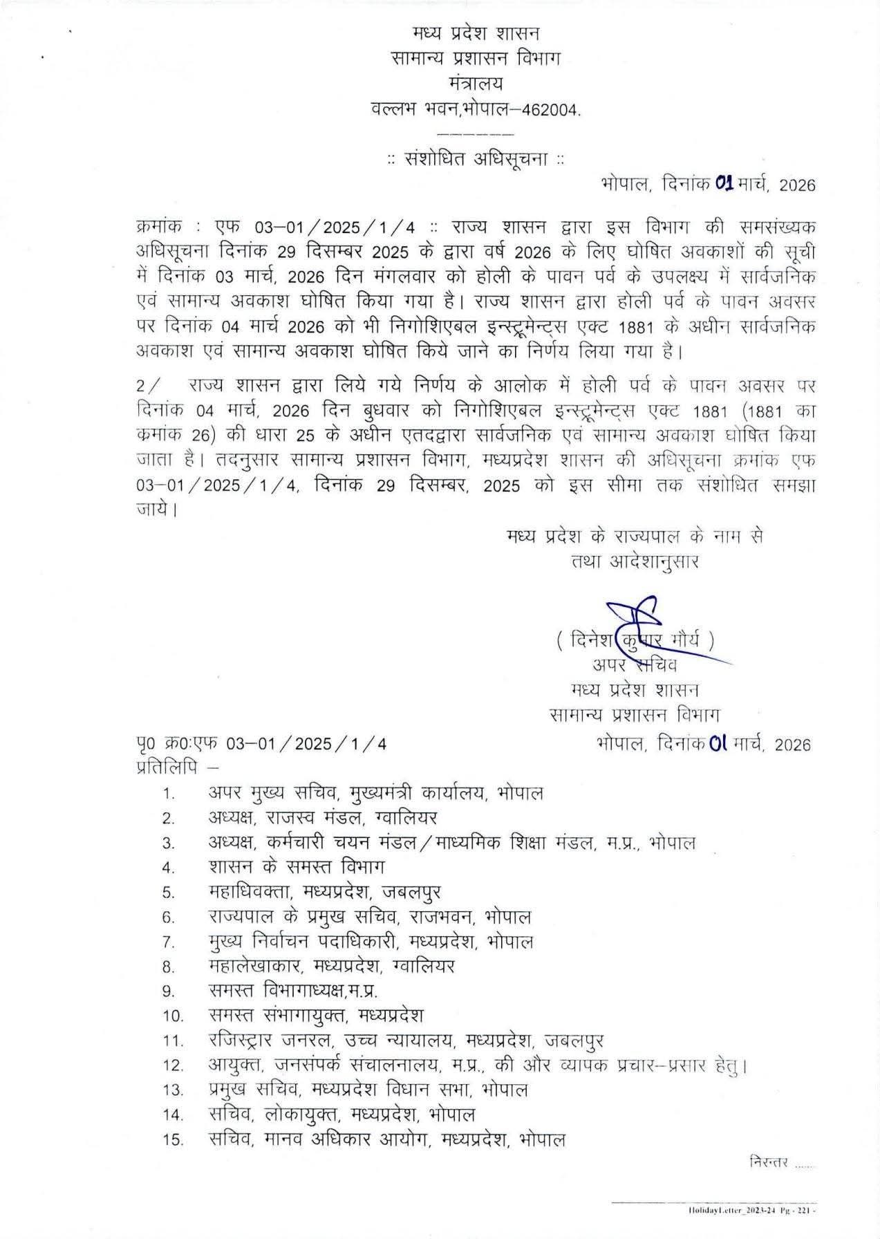 दरअसल, विभाग द्वारा 29 दिसम्बर 2025 को जारी अवकाश सूची में 03 मार्च 2026, दिन मंगलवार को होली के अवसर पर सार्वजनिक एवं सामान्य अवकाश घोषित किया गया था। अब राज्य शासन ने निर्णय लेते हुए 04 मार्च 2026 को भी निगोशिएबल इन्स्ट्रूमेन्ट्स एक्ट 1881 की धारा 25 के तहत सार्वजनिक अवकाश घोषित किया है। इस निर्णय के साथ पूर्व अधिसूचना को उक्त सीमा तक संशोधित माना जाएगा।