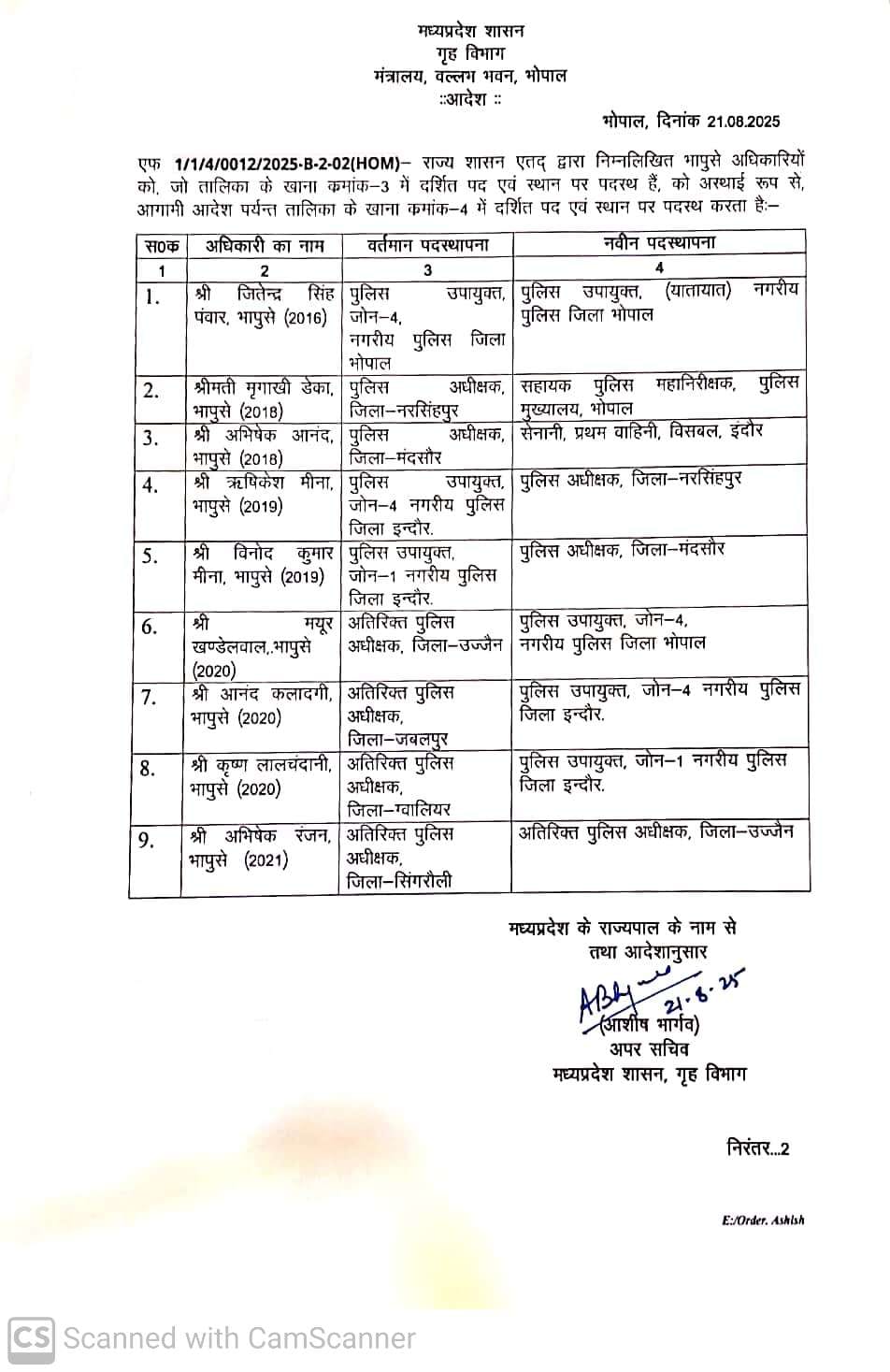 जारी सूची के अनुसार, भोपाल में पुलिस उपायुक्त (जोन-4) के पद पर कार्यरत 2016 बैच के आईपीएस जितेन्द्र सिंह पंवार को अब यातायात डीसीपी बनाया गया है। वहीं, नरसिंहपुर एसपी 2018 बैच की श्रीमती मृगाखी डेका को सहायक पुलिस महानिरीक्षक (एआईजी) पुलिस मुख्यालय भोपाल पदस्थ किया गया है।