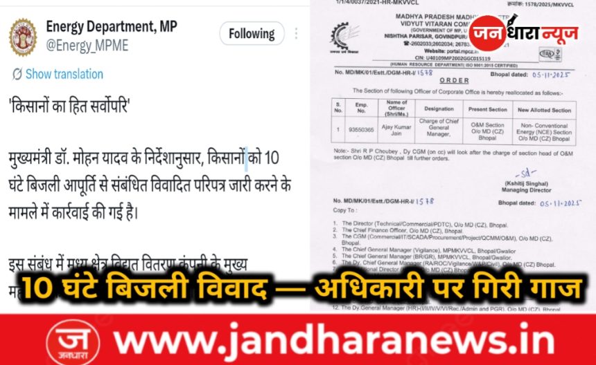भोपाल। मुख्यमंत्री डॉ. मोहन यादव के निर्देश के बाद किसानों को 10 घंटे बिजली आपूर्ति से जुड़ी विवादित अधिसूचना पर बड़ा एक्शन लिया गया है। ऊर्जा विभाग, मध्यप्रदेश ने बुधवार को मध्य क्षेत्र विद्युत वितरण कंपनी (मध्यांचल) के मुख्य महाप्रबंधक को उनके पद से हटाने का आदेश जारी किया। ऊर्जा विभाग ने सोशल मीडिया प्लेटफॉर्म एक्स (पूर्व ट्विटर) पर जानकारी साझा करते हुए कहा कि “किसानों का हित सर्वोपरि है।” मुख्यमंत्री के निर्देश पर यह कार्रवाई की गई है।